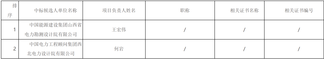 第一中标候选人为中国能源建设集团山西省电力勘测设计院有限公司,投标报价为120169100元,折合单价0.7069元/Wh;第二中标候选人为中国电力工程顾问集团西北电力设计院有限公司,投标报价为123443409元,折合单价0.7261元/Wh。