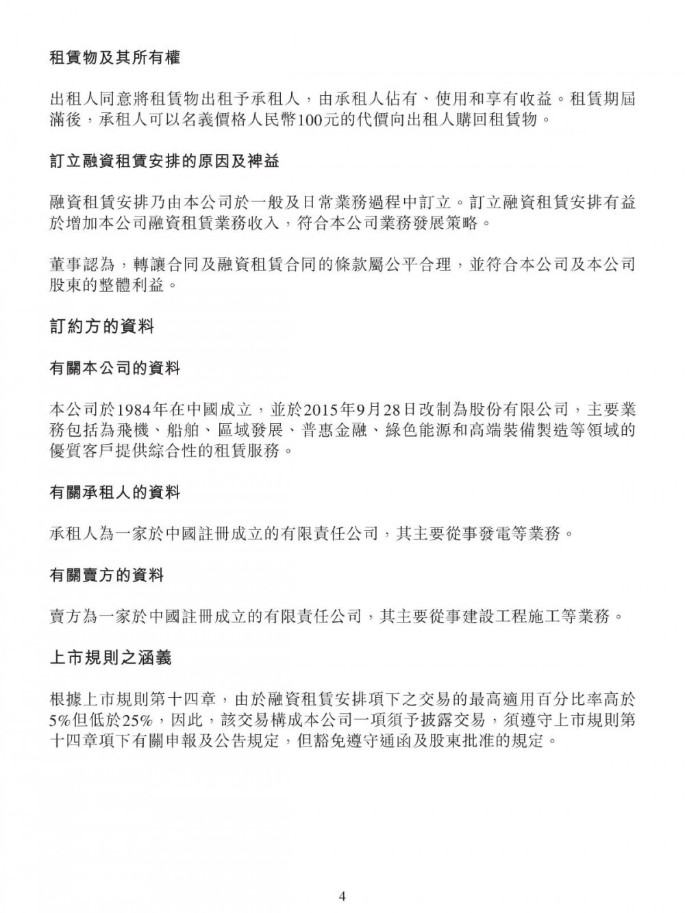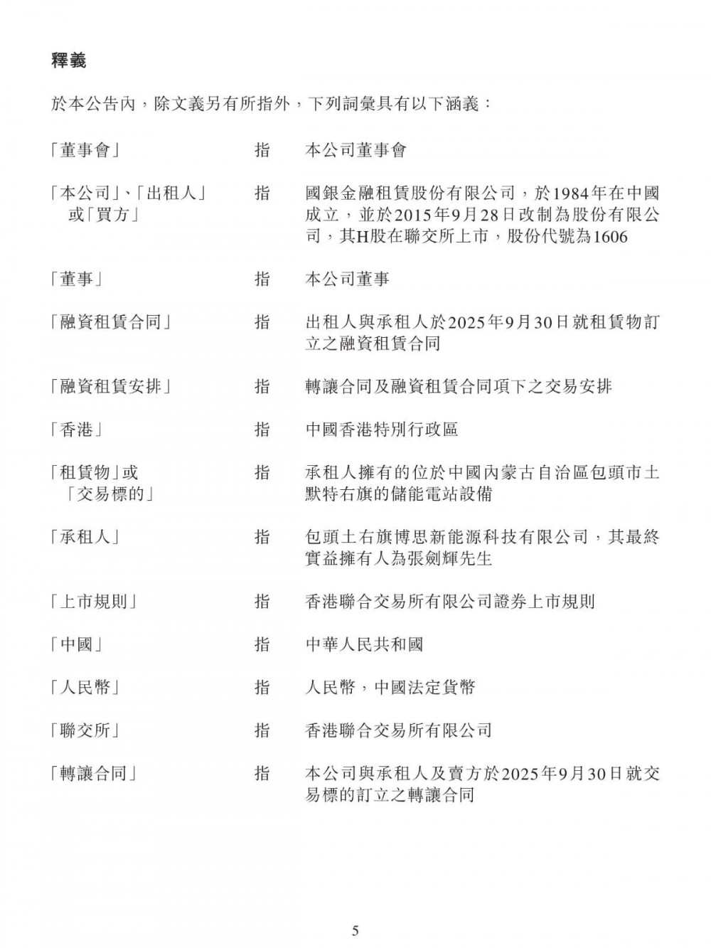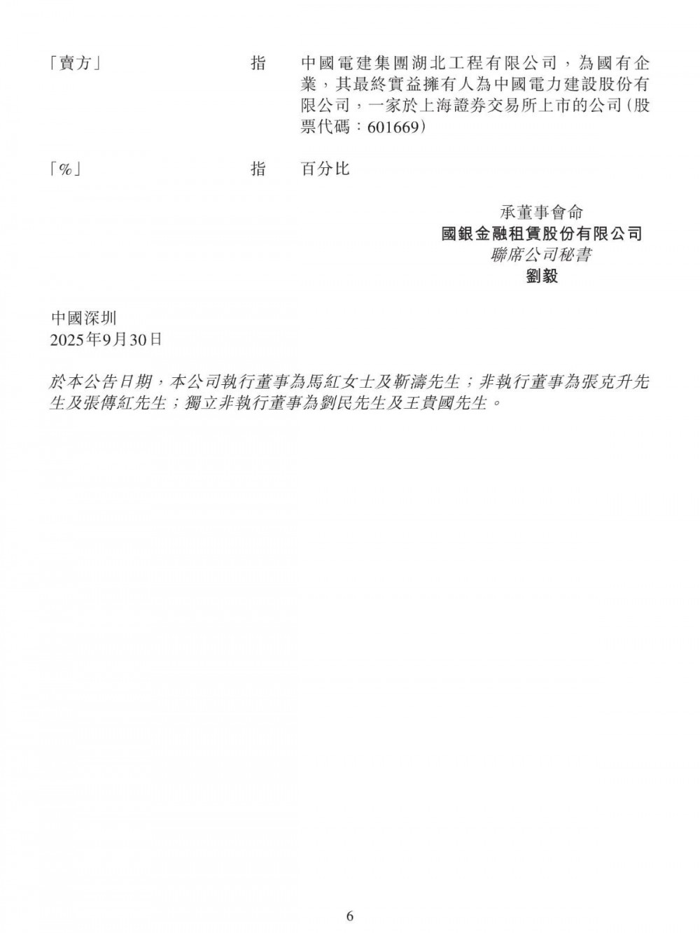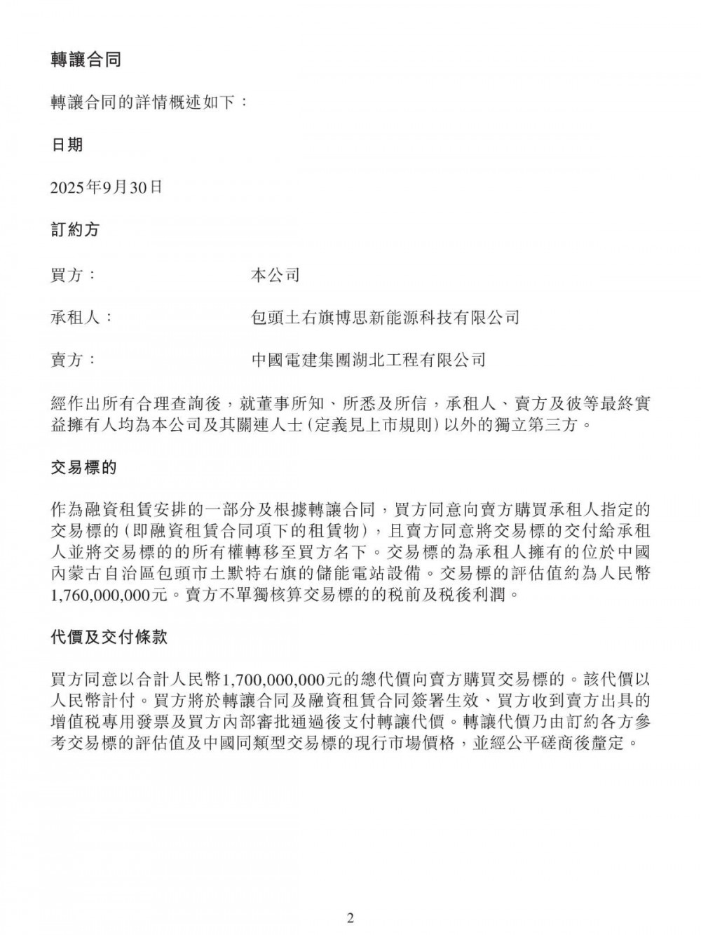 近日,国银金租发布公告,董事会宣布公司作为出租人与承租人及卖方于2025年9月30日订立融资租赁安排。根据该安排,国银金租以17亿元向卖方中国电建集团湖北工程有限公司购买交易标的,并与承租人包头土右旗博思新能源科技有限公司签订融资租赁合同,租赁期为120个月。