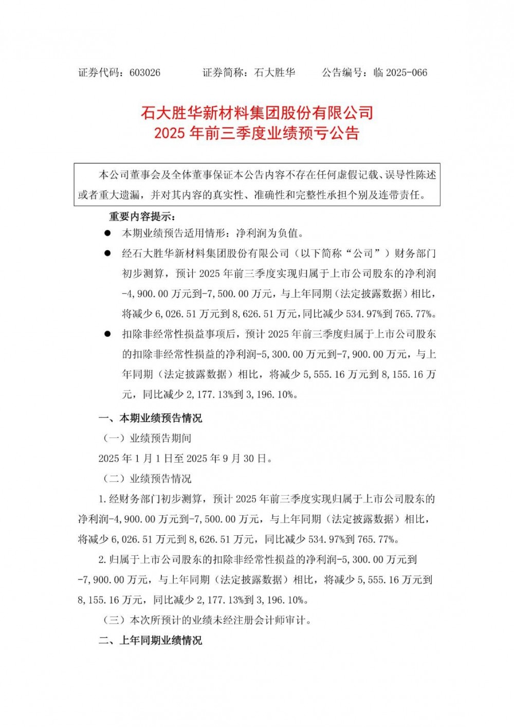 10月15日,石大胜华发布公告称,预计2025年前三季度实现归属于上市公司股东的净利润-4,900.00万元到-7,500.00万元,与上年同期(法定披露数据)相比,将减少6,026.51万元到8,626.51万元,同比减少534.97%到765.77%。扣除非经常性损益事项后,预计2025年前三季度归属于上市公司股东的扣除非经常性损益的净利润-5,300.00万元到-7,900.00万元,与上年同期(法定披露数据)相比,将减少5,555.16万元到8,155.16万元,同比减少2,177.13%到3,196.10%。
