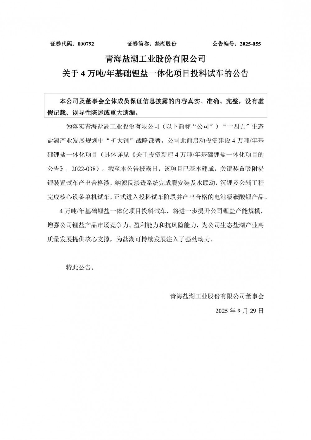 公告显示,4万吨/年基础锂盐一体化项目投料试车,将进一步提升公司锂盐产能规模,增强公司锂盐产品市场竞争力、盈利能力和抗风险能力,为公司生态盐湖产业高质量发展提供核心支撑,为盐湖可持续发展注入了强劲动力。