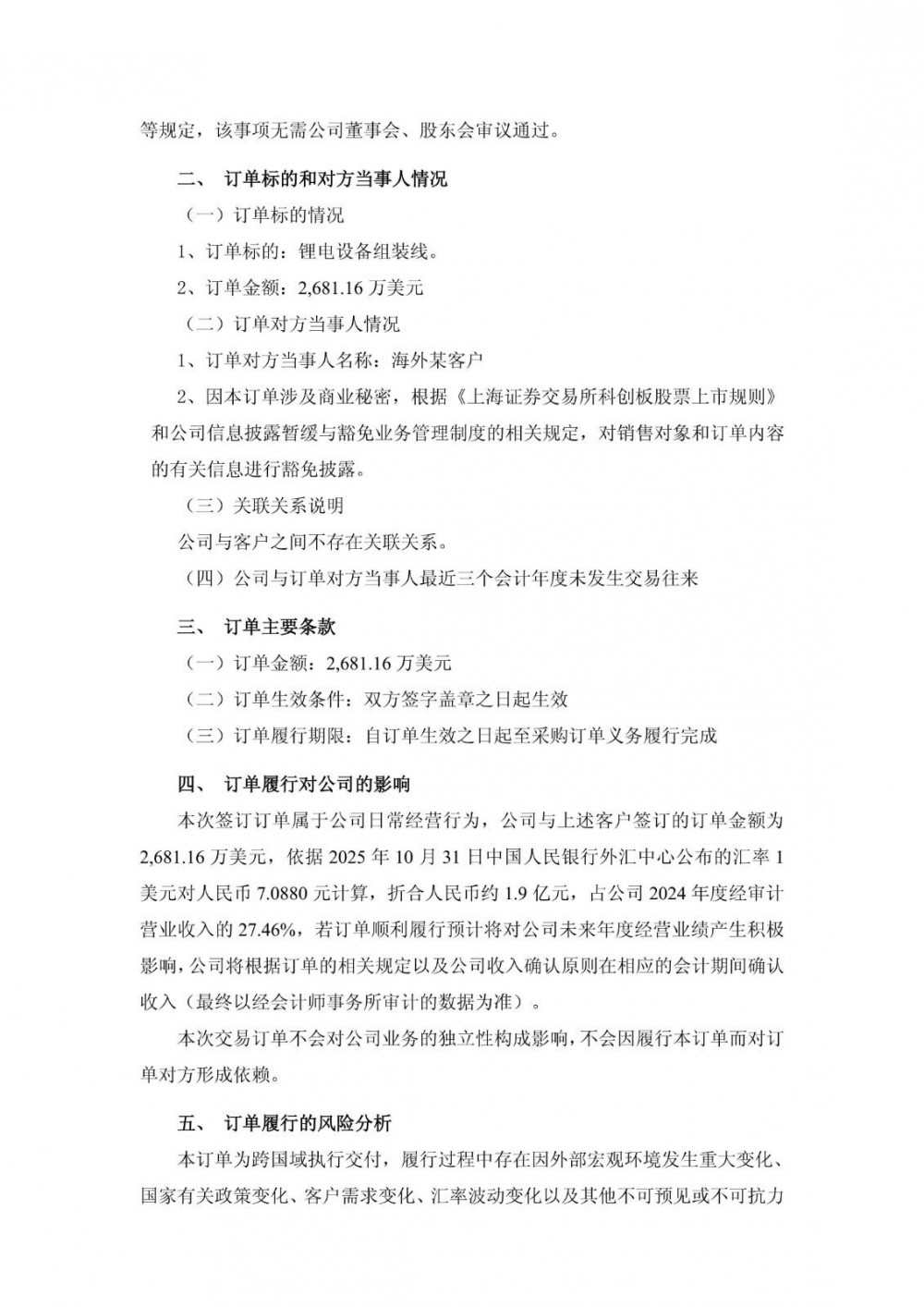 逸飞激光表示,本订单为跨国域执行交付,履行过程中存在因外部宏观环境发生重大变化、国家有关政策变化、客户需求变化、汇率波动变化以及其他不可预见或不可抗力等因素影响最终执行和盈利的情况,本订单中未约定的其他条款均以双方后续签定的具体合同约定为准,公司将持续跟进订单履行情况并及时履行信息披露义务,敬请广大投资者理性投资,注意投资风险。