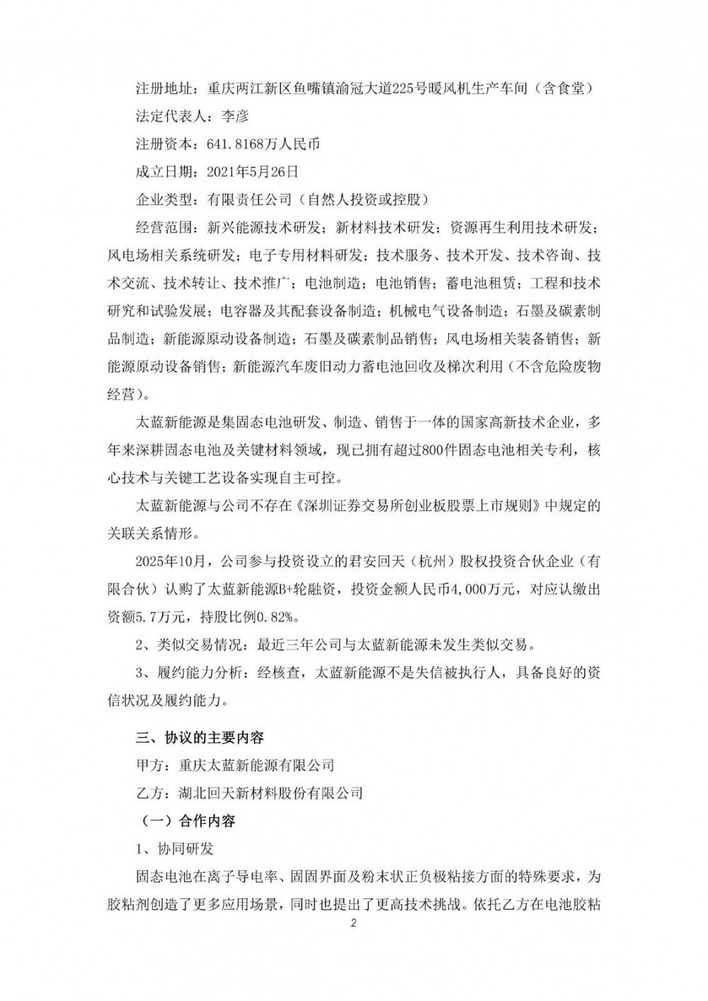 近日,回天新材发布公告称,公司与重庆太蓝新能源有限公司签订了《战略合作协议》,拟充分发挥双方在各自领域的管理、技术、渠道、平台等优势,围绕固态电池及其关键材料领域的业务经营、产融结合等开展战略合作。