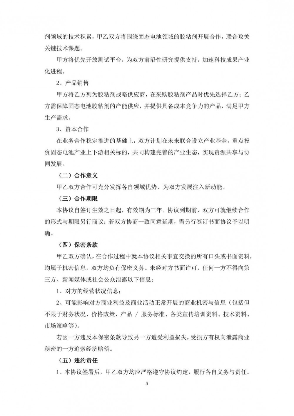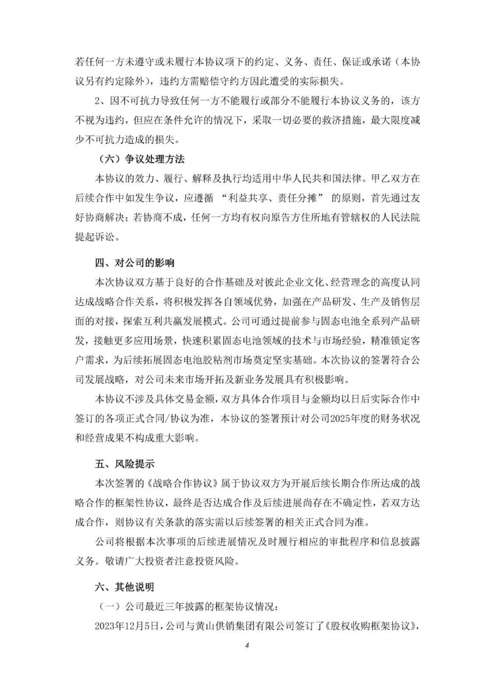 回天新材表示,本次协议双方基于良好的合作基础及对彼此企业文化、经营理念的高度认同达成战略合作关系,将积极发挥各自领域优势,加强在产品研发、生产及销售层面的对接,探索互利共赢发展模式。公司可通过提前参与固态电池全系列产品研发,接触更多应用场景,快速积累固态电池领域的技术与市场经验,精准锁定客户需求,为后续拓展固态电池胶粘剂市场奠定坚实基础。本次协议的签署符合公司发展战略,对公司未来市场开拓及新业务发展具有积极影响。