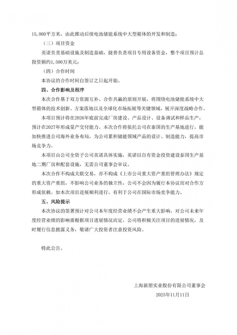 11月10日,新朋股份发布公告称,公司下属全资子公司泰国英诺实业股份有限公司与美国捷普公司签署《电池储能系统项目》投资合作协议,围绕电池储能系统中大型箱体等项目,共同投资开发合作。