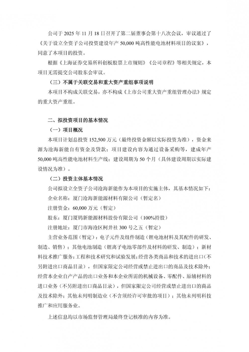 11月18日,厦钨新能发布公告称,近年来,电池行业技术发展较快,对电池材料提出更高的要求,新能源汽车、储能和消费电子对高性能电池需求激增。为抓住市场机遇,提升公司核心竞争力,厦门厦钨新能源材料股份有限公司拟出资60,000万元设立全资子公司厦门沧海新能源材料有限公司(暂定名,具体以登记部门核准名称为准,以下简称“沧海新能”)投资建设年产50,000吨高性能电池材料项目,项目预计总投资金额为人民币152,500万元,资金来源为自有资金及贷款。