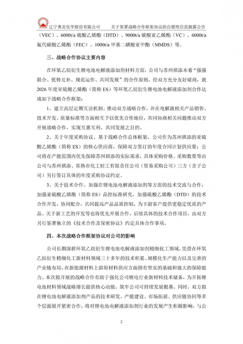 在环氧乙烷衍生锂电池电解液添加剂材料方面,奥克股份与苏州祺添本着“强强联合、优势互补、规范运作、共同发展”的合作原则,经双方充分友好磋商,就2026年度亚硫酸乙烯酯等环氧乙烷衍生锂电池电解液添加剂合作达成如下战略合作框架: