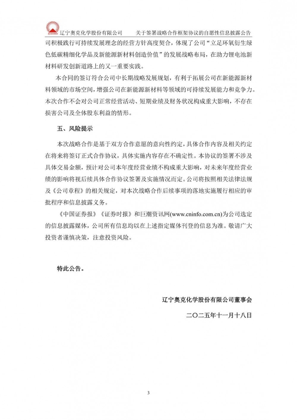 奥克股份表示,本合同的签订符合公司中长期战略发展规划,有利于拓展公司在新能源新材料领域的市场空间,增强公司在新能源新材料等领域的可持续发展能力和竞争力。本次合作不会对公司正常经营活动、短期业绩及财务状况构成重大影响,不存在损害公司及全体股东利益的情形。