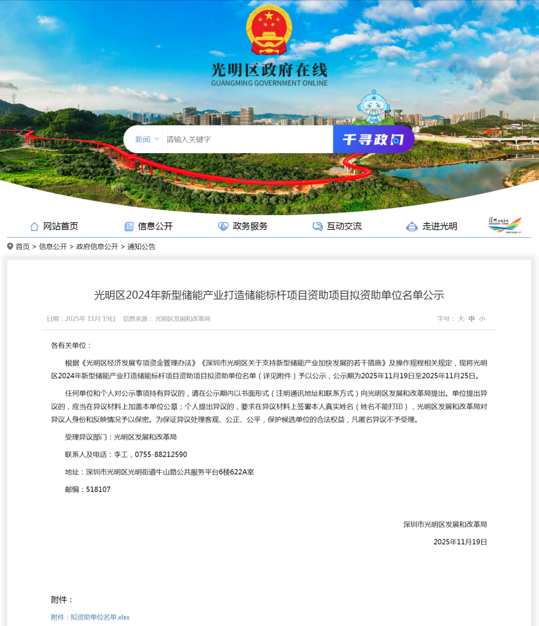根据《光明区经济发展专项资金管理办法》《深圳市光明区关于支持新型储能产业加快发展的若干措施》及操作规程相关规定,现将光明区2024年新型储能产业打造储能标杆项目资助项目拟资助单位名单(详见附件)予以公示,公示期为2025年11月19日至2025年11月25日。