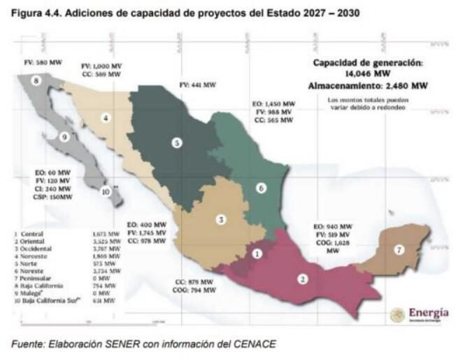 新增装机容量的区域分布遵循全国覆盖战略。预计2025年至2030年间新增装机容量最大的区域控制管理区(GCR)如下:半岛地区(3,842兆瓦);北部和东北部地区(3,497兆瓦);中部地区(3,282兆瓦);东部和西部地区合计(2,984兆瓦);以及下加利福尼亚州(1,774兆瓦)。这些数据包括发电和储能容量,其计算基于需求预测、工业增长、可再生能源并网容量以及节点可靠性标准。