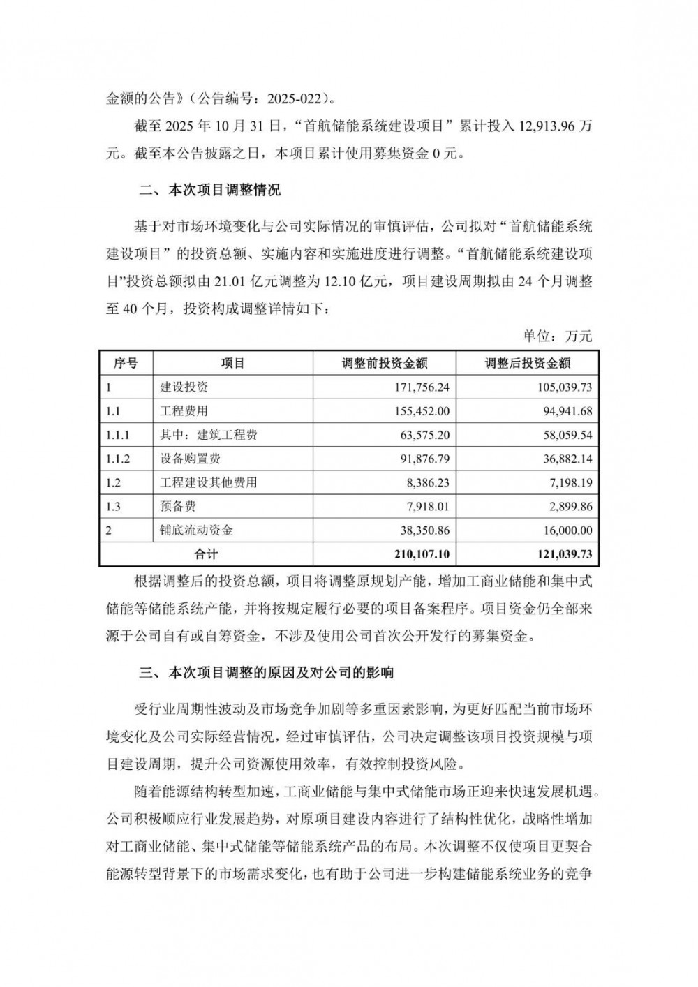 11月20日,首航新能发布公告称,基于对市场环境变化与公司实际情况的审慎评估,公司拟对“首航储能系统建设项目”的投资总额、实施内容和实施进度进行调整。“首航储能系统建设项目”投资总额拟由21.01亿元调整为12.10亿元,项目建设周期拟由24个月调整至40个月。