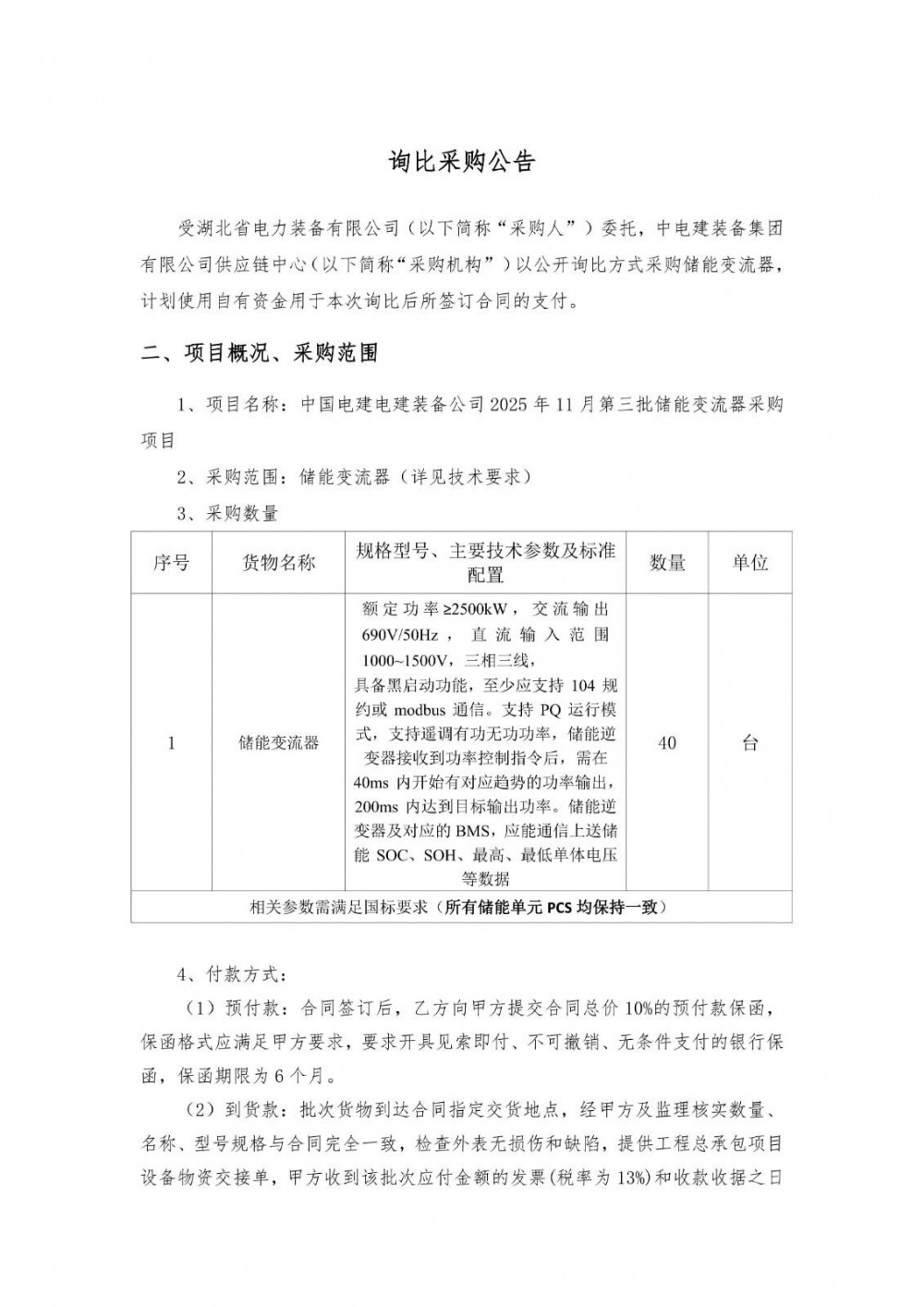 11月20日,中国电建电建装备公司2025年11月第三批储能变流器采购项目公开询比采购公告发布。