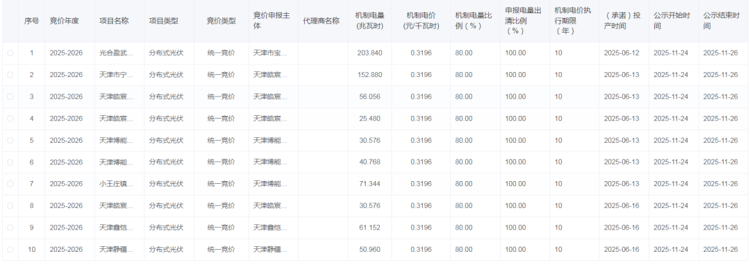电力家获悉,11月24日,国网新能源云公示天津2026年统一竞价项目竞价出清结果。