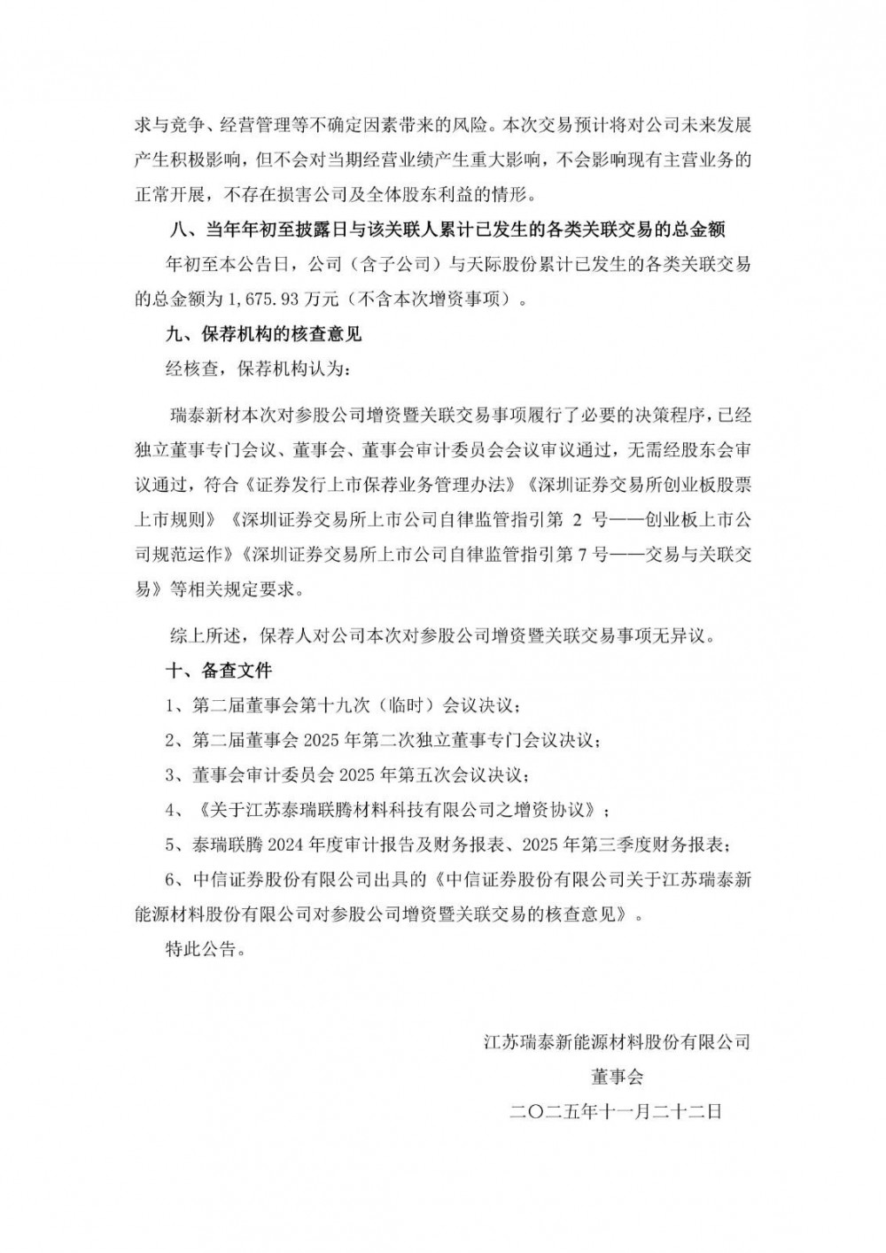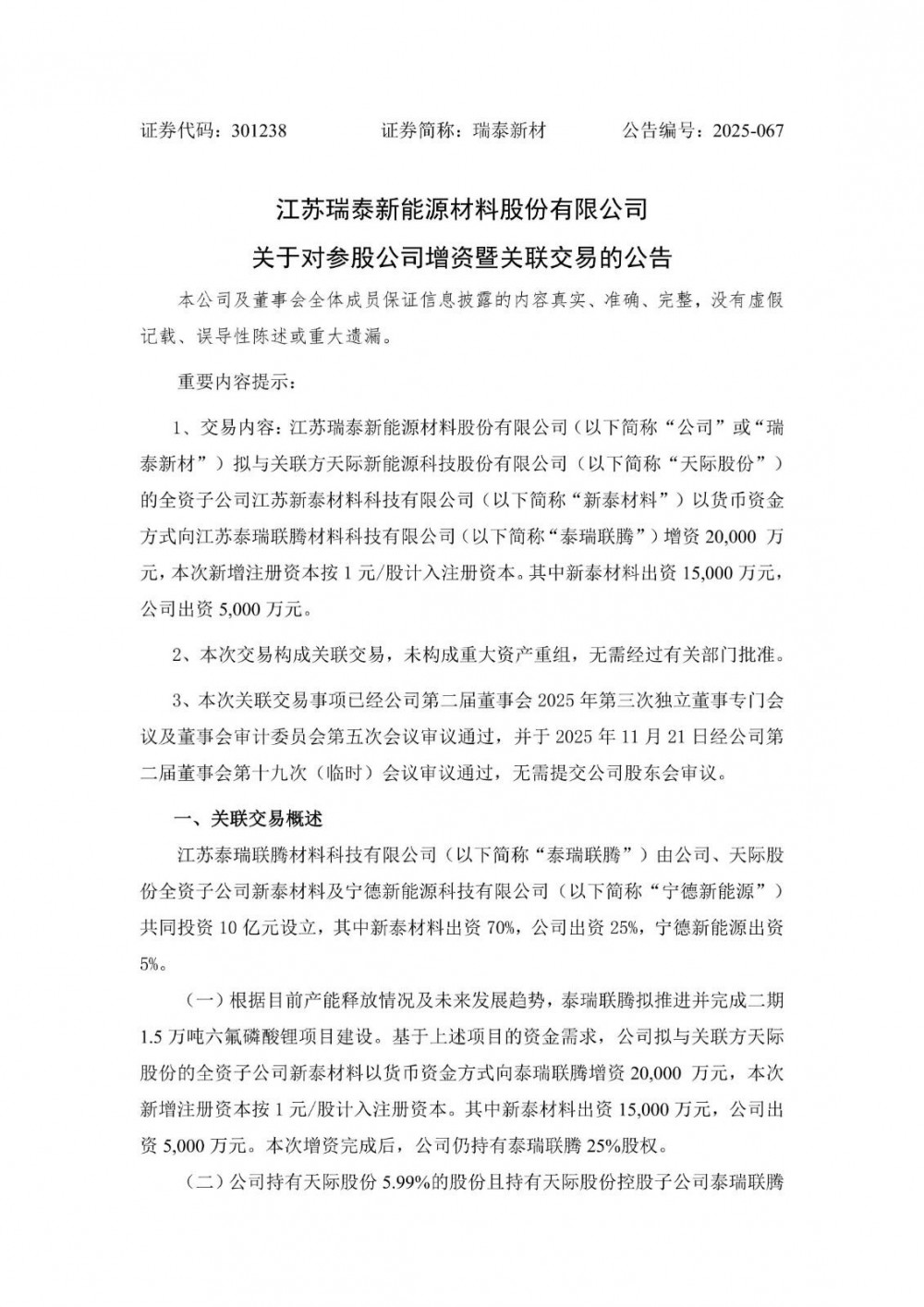 近日,瑞泰新材发布公告称,公司拟与关联方天际新能源科技股份有限公司的全资子公司江苏新泰材料科技有限公司以货币资金方式向江苏泰瑞联腾材料科技有限公司增资20,000万元,本次新增注册资本按1元/股计入注册资本。其中新泰材料出资15,000万元,公司出资5,000万元。