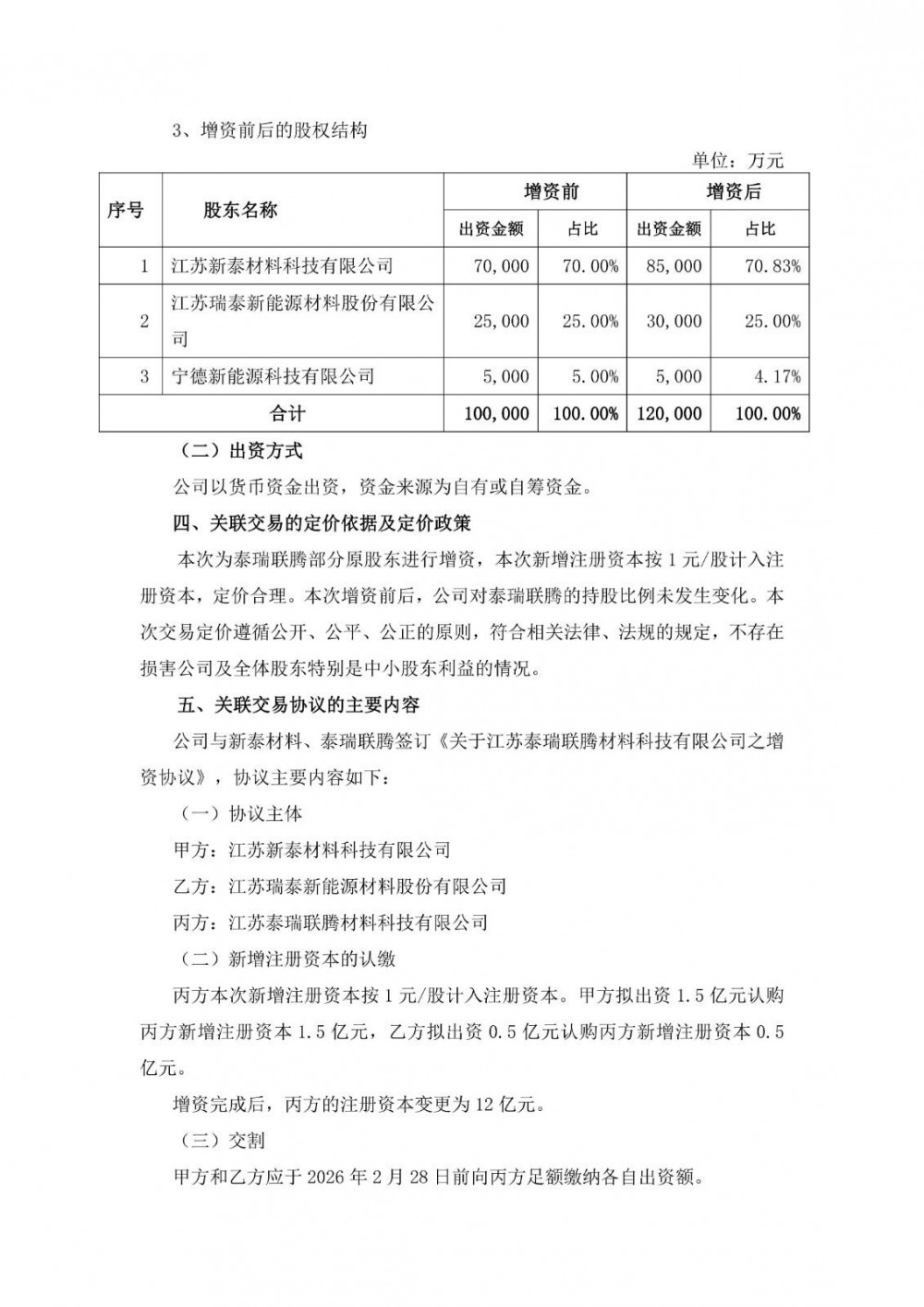 根据目前产能释放情况及未来发展趋势,泰瑞联腾拟推进并完成二期1.5万吨六氟磷酸锂项目建设。基于上述项目的资金需求,公司拟与关联方天际股份的全资子公司新泰材料以货币资金方式向泰瑞联腾增资20,000万元,本次新增注册资本按1元/股计入注册资本。其中新泰材料出资15,000万元,公司出资5,000万元。本次增资完成后,公司仍持有泰瑞联腾25%股权。