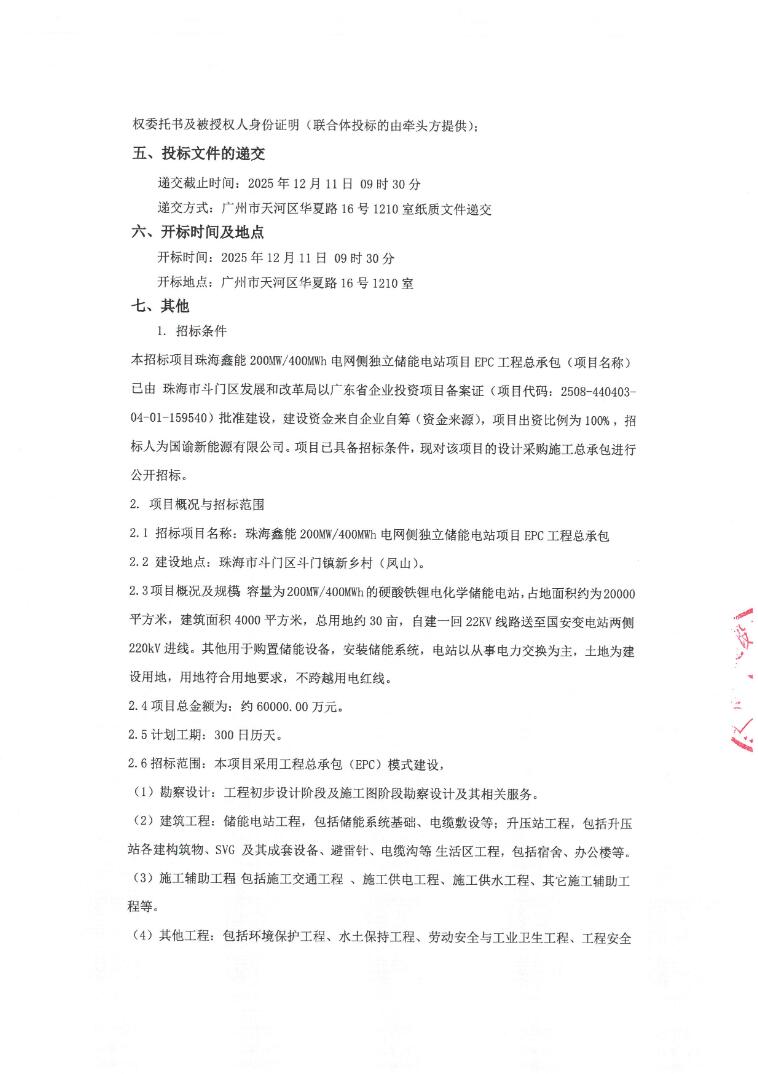 近日,珠海鑫能200MW/400MWh电网侧独立储能电站项目EPC工程总承包招标公告发布。