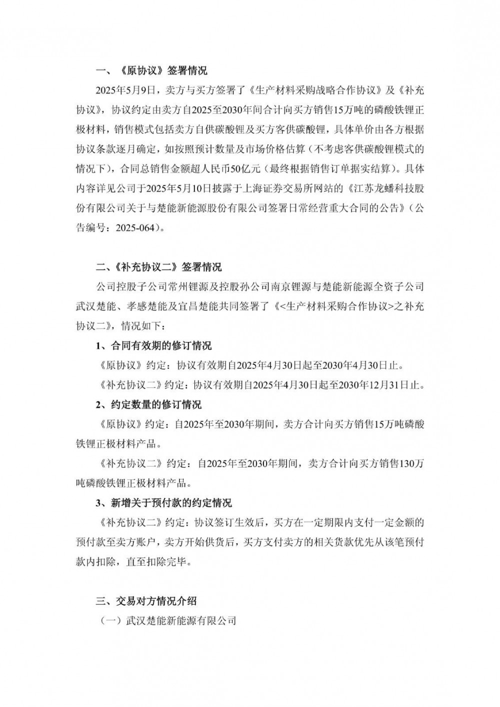 根据公告,本次补充协议将2025年至2030年期间约定的磷酸铁锂正极材料销售总量从15万吨大幅上调至130万吨,合同有效期从原定的2030年4月30日延长至2030年12月31日。如按预计数量及市场价格估算(不考虑客供碳酸锂模式),《补充协议二》与《原协议》总销售金额超人民币450亿元(最终根据销售订单据实结算)。《补充协议二》自2025年11月24日起生效。