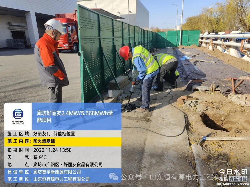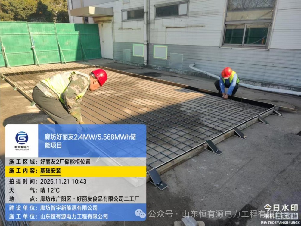 冬潮涌动施工忙,储能布局启新程。为深入贯彻国家“双碳”战略部署,积极响应能源结构转型号召,2025年11月25日,由山东恒有源电力工程有限公司承建的重点储能项目——“廊坊好丽友2.425MW/5.597MWh储能项目”正式破土动工。这既是公司加码储能赛道、完善新能源产业链的关键举措,更是助力构建新型电力系统、推动能源变革的重要实践,为实现清洁低碳、安全高效的能源体系注入强劲动能。