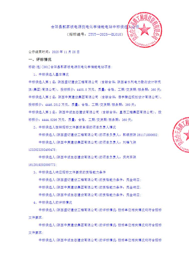 11月25日,合阳县郭家坡电源侧电化学储能电站中标候选人公示。