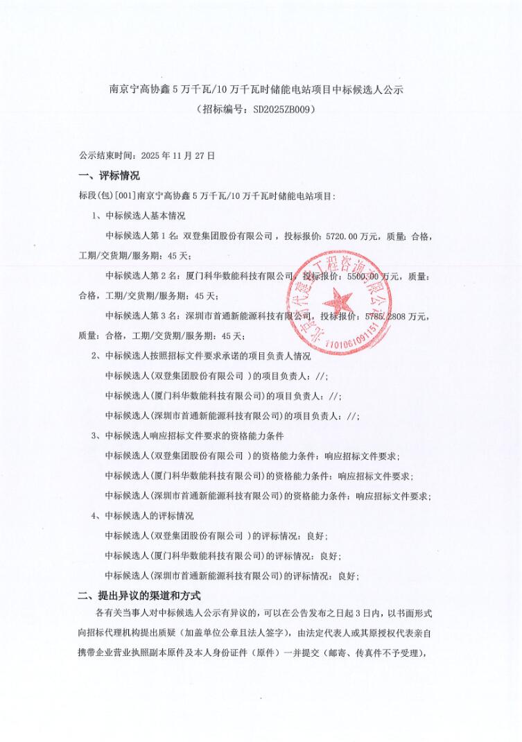 第一中标候选人:双登集团股份有限公司,投标报价:5720.00万元,折合单价0.572元/Wh;第二中标候选人:厦门科华数能科技有限公司,投标报价:5500.00万元,折合单价0.55元/Wh;第三中标候选人:深圳市首通新能源科技有限公司,投标报价:5785.2808万元,折合单价0.5785元/Wh。