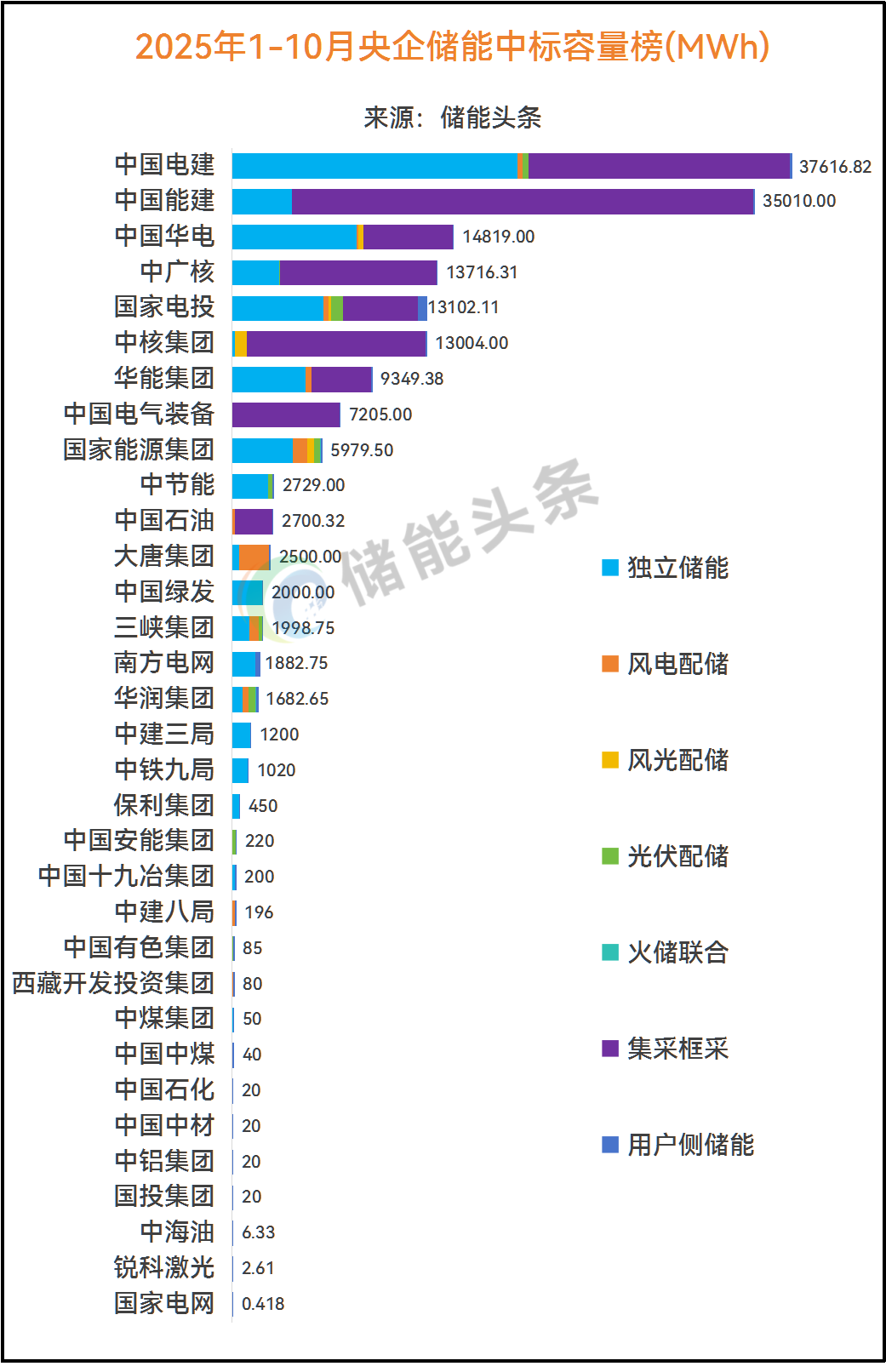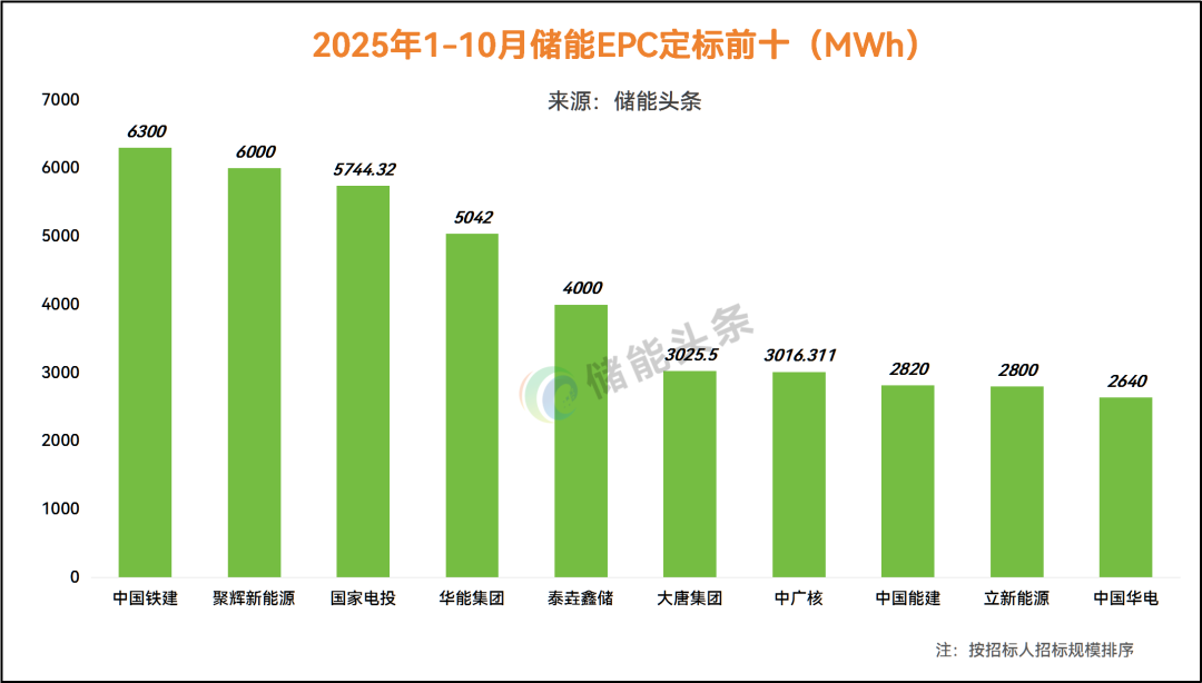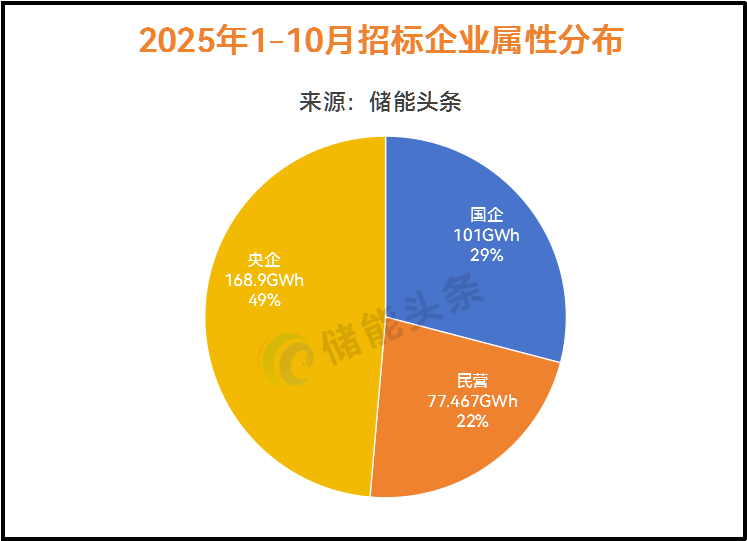 在定标规模上,根据电力家不完全统计,2025年1-10月定标规模合计95.8GW/347.4GWh(含集采),其中,央企定标容量168.9GWh,占比为49%;国企开标101GWh,占比29%;民营企业开标77.467GWh,占22%;中国能建、中国电建、中国华电、中核集团、中广核、国家电投定标规模超10GWh。