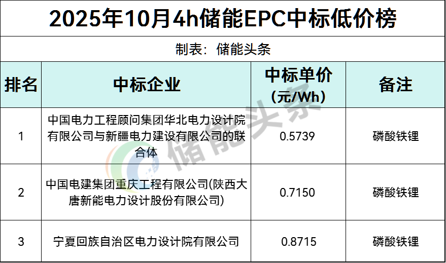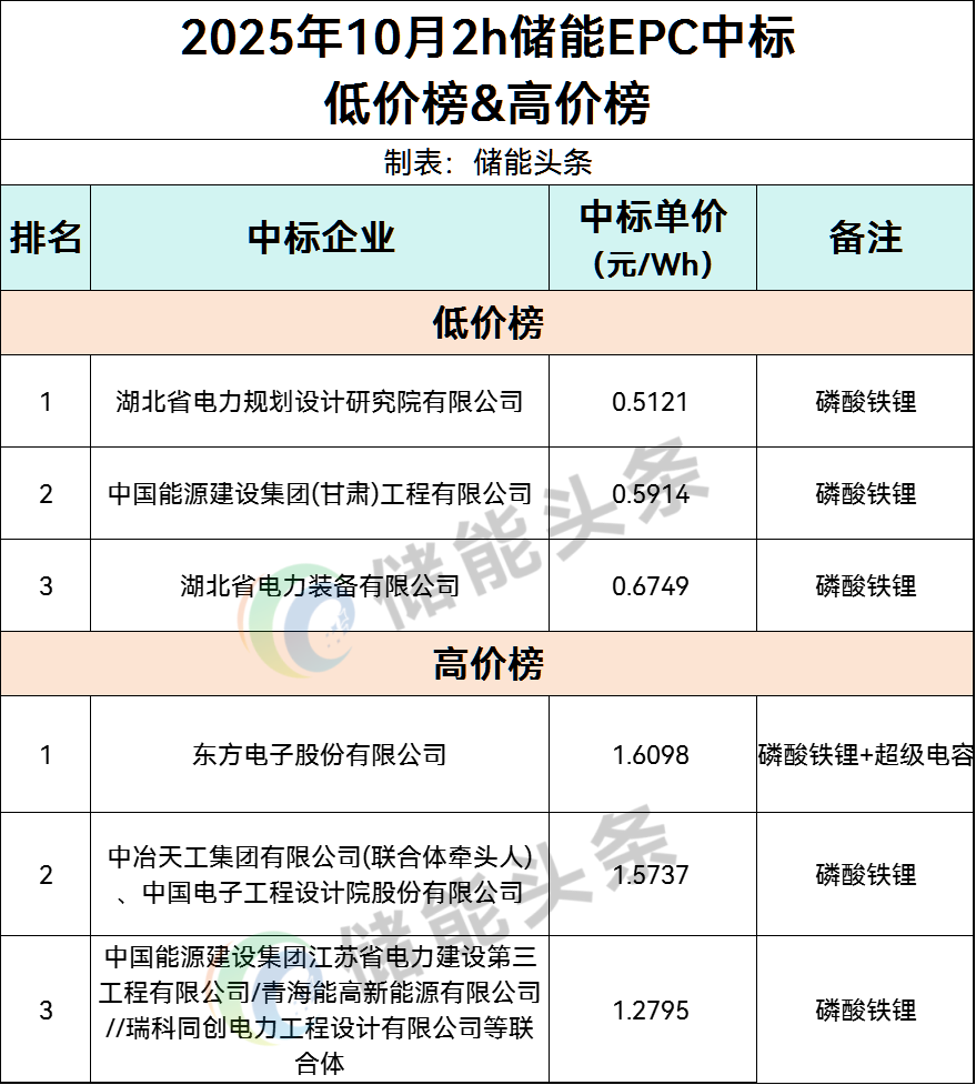 EPC最低价为0.5121元/Wh,由湖北省电力规划设计研究院有限公司在中广核新能源湖北公安108MW216MWh储能项目EPC总承包施工采购中报出。