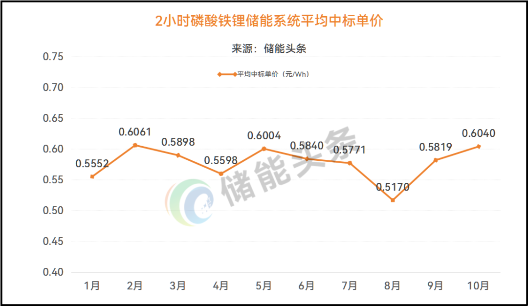 按月平均中标单价计算,1-10月,2小时储能系统平均中标单价处于0.517~0.6061元/Wh之间。10月份,2小时储能系统平均中标单价为0.604元/Wh,较9月中标单价0.5819元/Wh增长3.8%。