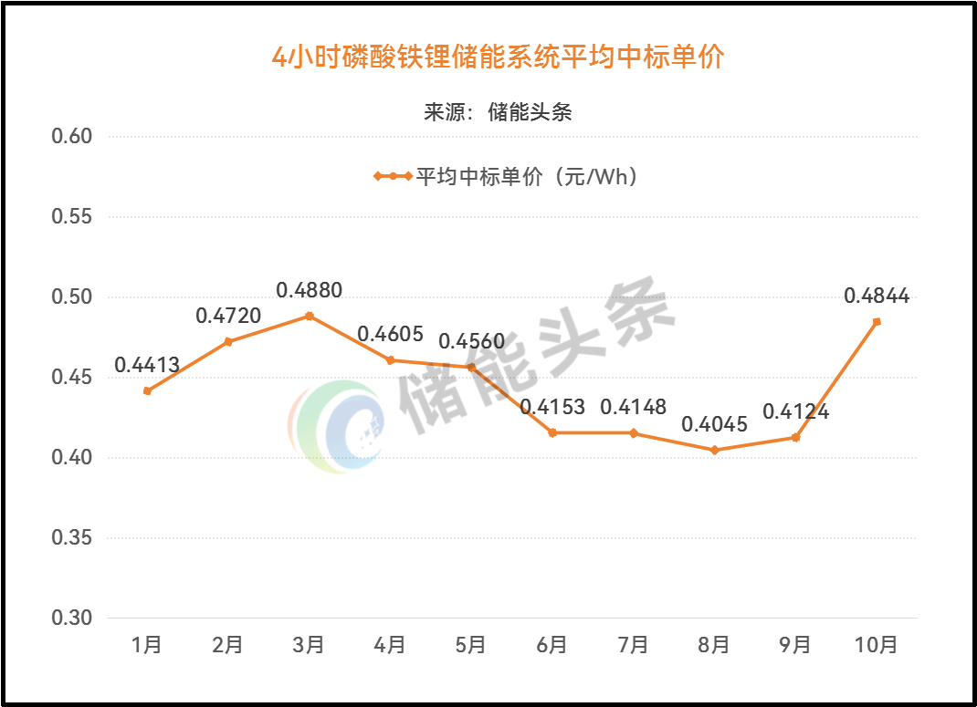 按月平均中标单价计算,1-10月,4小时储能系统平均中标单价处于0.4045~0.488元/Wh之间。10月4小时储能系统平均中标单价为0.4844元/Wh,较9月中标单价0.4124元/Wh增长17.46%。