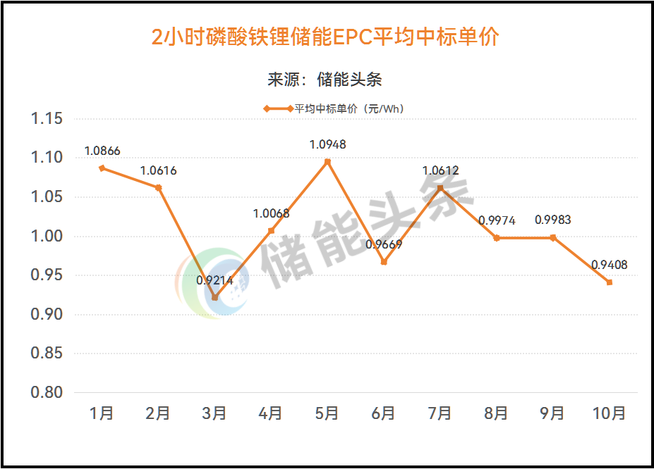 1-10月,4小时磷酸铁锂储能储能EPC中标单价在0.542~1.9元/Wh之间,均价为0.9448元/Wh。