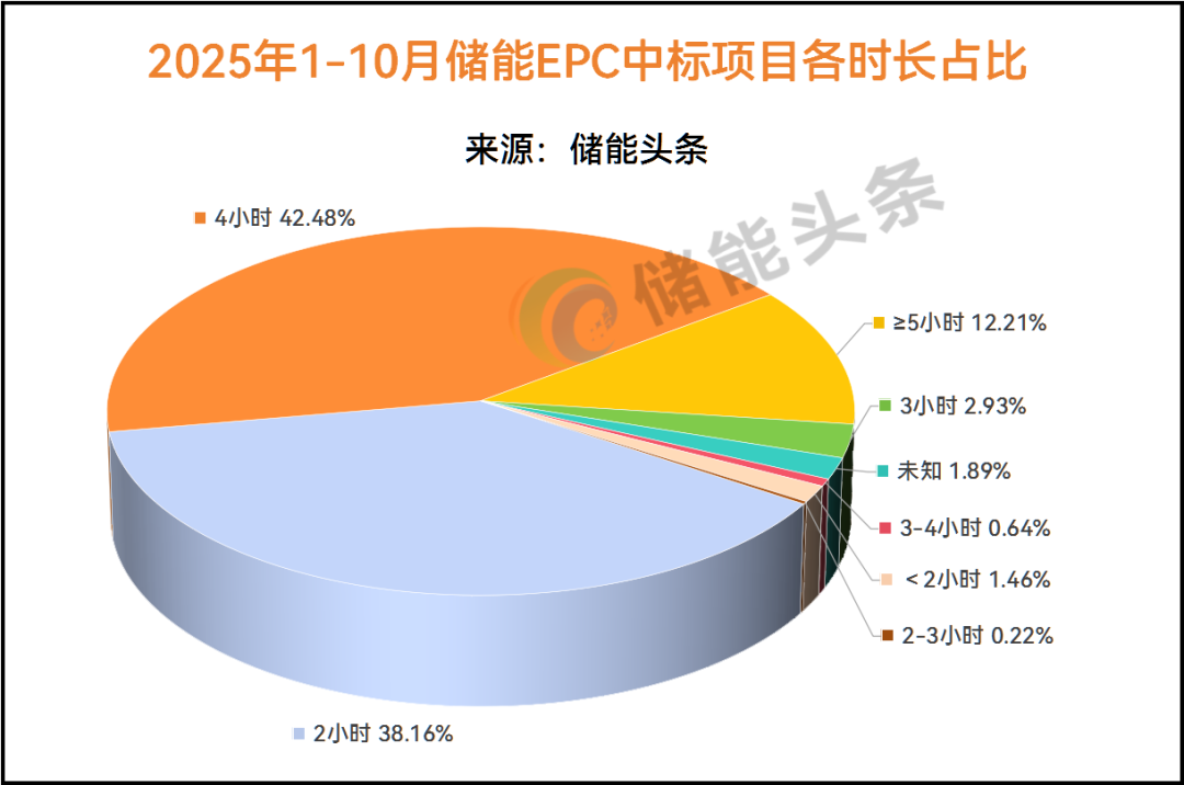 从储能时长来看,据电力家统计,2025年1-10月储能EPC项目中,4小时储能仍然占据多数份额,占比约为42.48%,其次是2小时储能时长占比达38.16%,≥5小时储能占12.21%,3小时占2.93%。