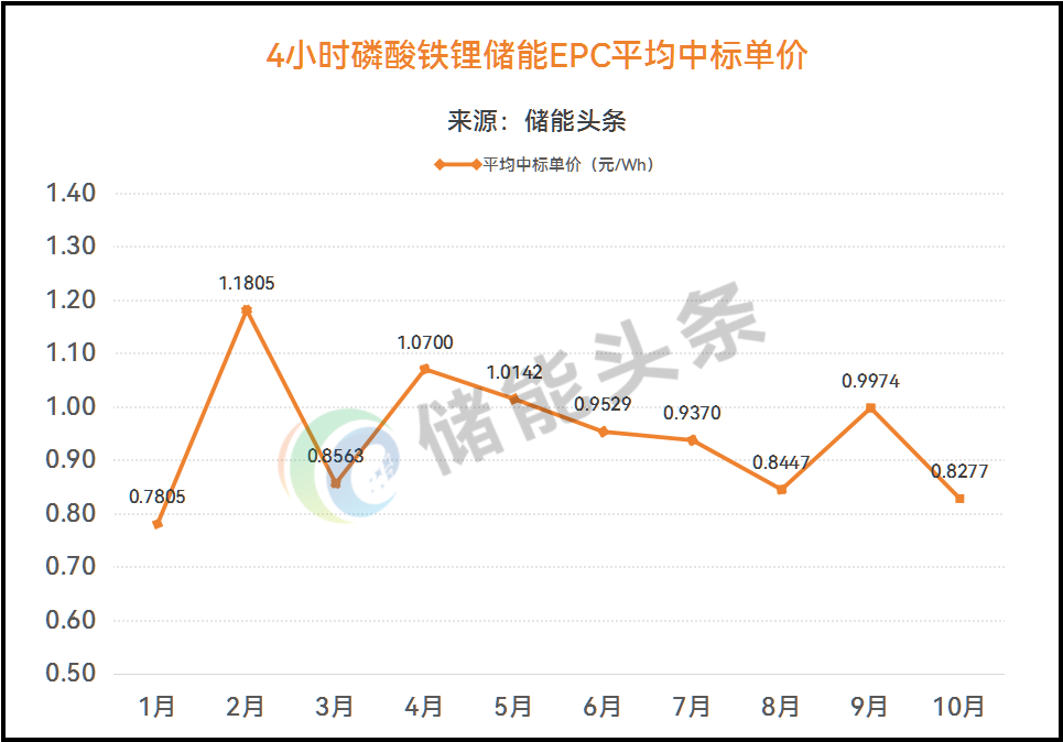 10月份,4小时储能EPC中标平均单价为0.8277元/Wh,较9月中标单价0.9974元/Wh,下降17.01%。1-10月,4小时磷酸铁锂储能储能EPC中标单价在0.542~1.9元/Wh之间,均价为0.9448元/Wh。