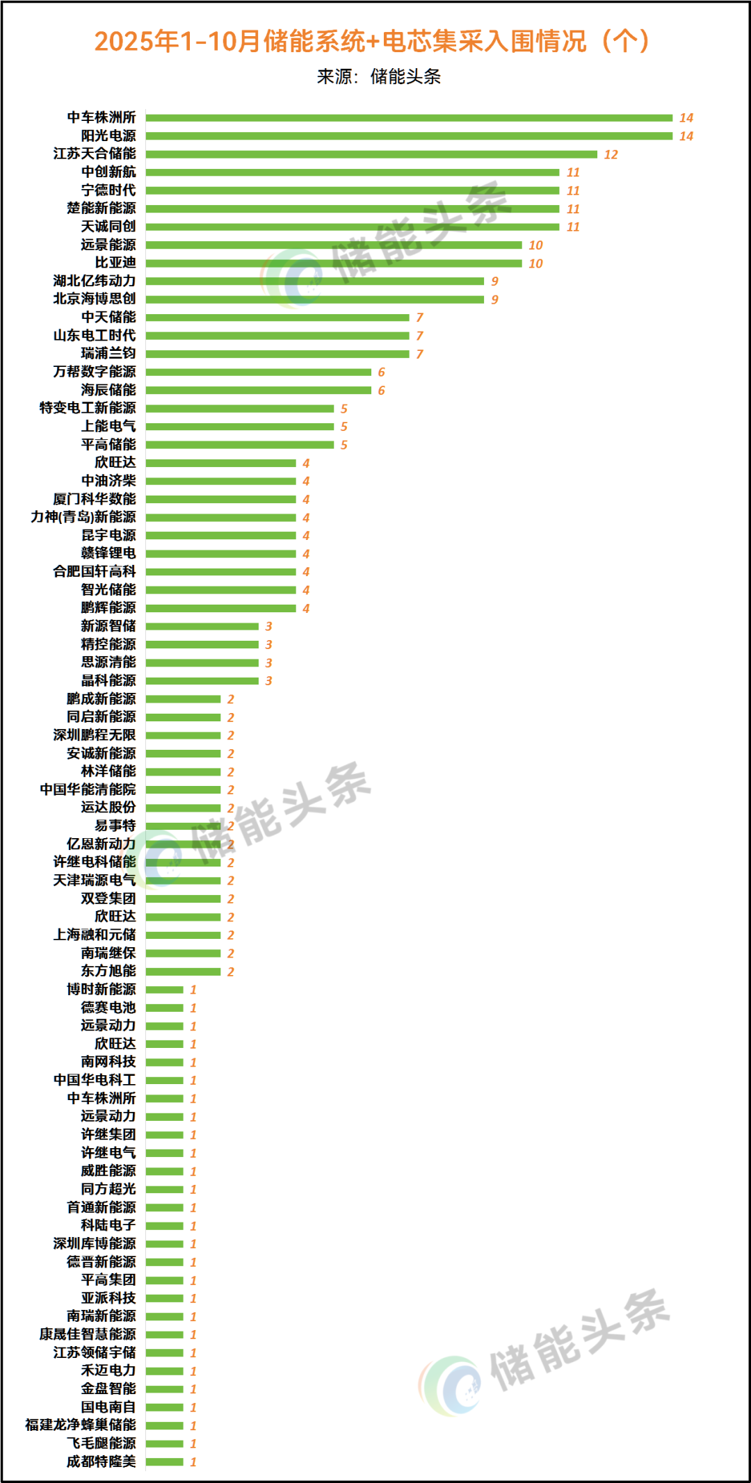 在2025年1-10月已开标的储能系统+电芯集采中,共有75家企业入围中标。其中,阳光电源和中车株洲所中标数量最多,中标数量达到14个,天合储能中标12个,紧随其后,中创新航、宁德时代、楚能新能源、天诚同创中标入围11个,远景能源、比亚迪中标10个,北京海博思创、湖北亿纬动力入围9个、瑞浦兰钧、中天储能、山东电工时代入围7个。