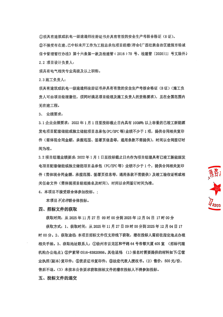 企业业绩要求:2022年1月1日至投标截止日内具有100MWh以上容量的已竣工新能源发电项目配套储能或独立储能项目总承包(PC/EPC等)业绩不少于1项。