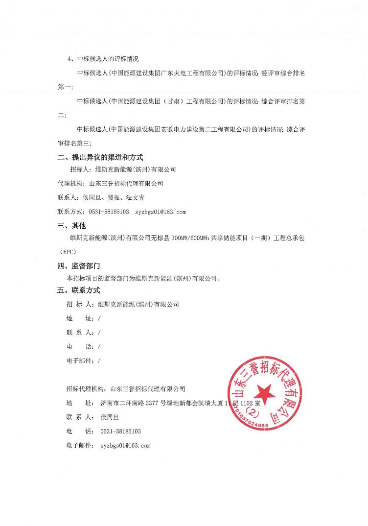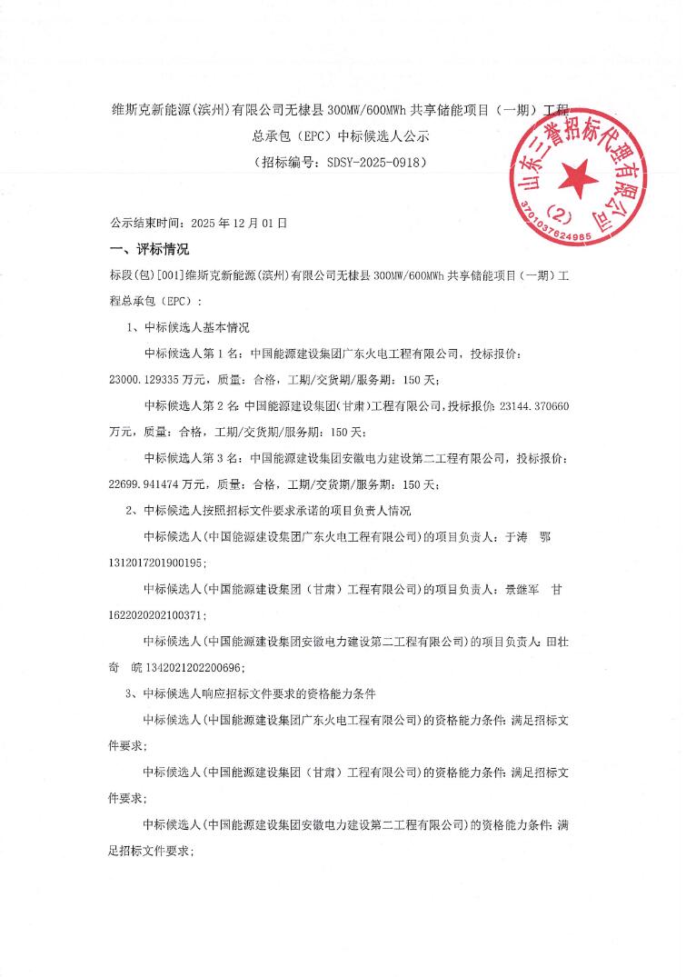 11月28日,维斯克新能源(滨州)有限公司无棣县300MW/600MWh共享储能项目(一期)工程总承包(EPC)中标候选人公示。