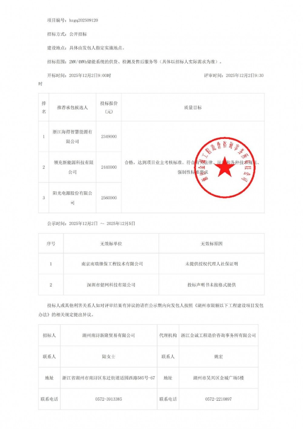 第一中标候选人为浙江海得智慧能源有限公司,投标报价为2349000元,折合单价0.5873元/Wh;第二中标候选人为领充新能源科技有限公司,投标报价为2440000元,折合单价0.61元/Wh;第三中标候选人为阳光电源股份有限公司,投标报价为2560000元,折合单价0.64元/Wh。