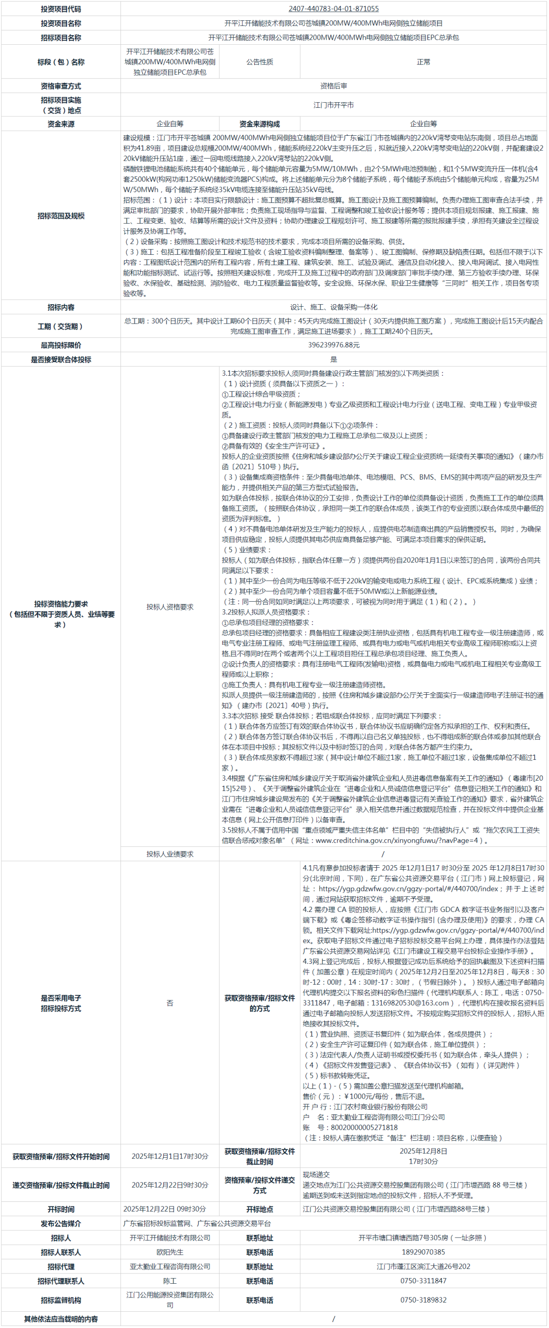 电力家获悉,12月1日,开平江开储能技术有限司苍城镇200MW/400MWh电网侧独立储能项目EPC总承包招标公告发布。