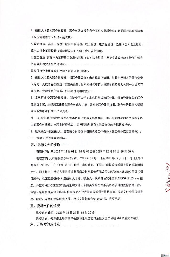 12月1日,天津银龙预应力材料股份有限公司3MW/6MWh储能EPC项目公开招标公告发布。