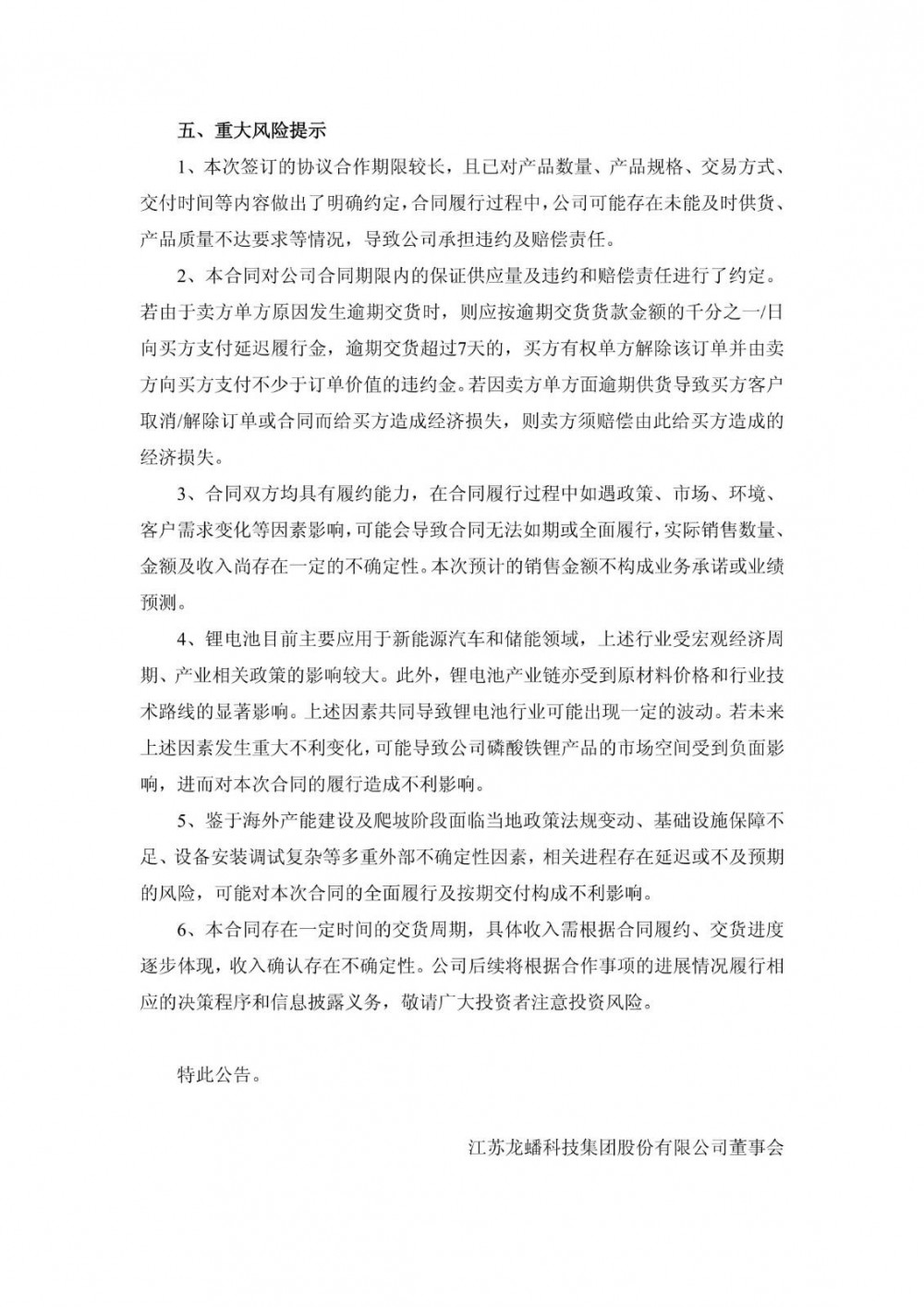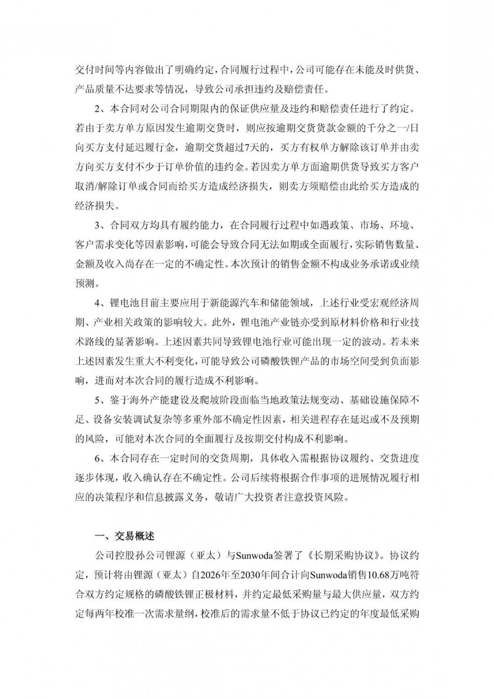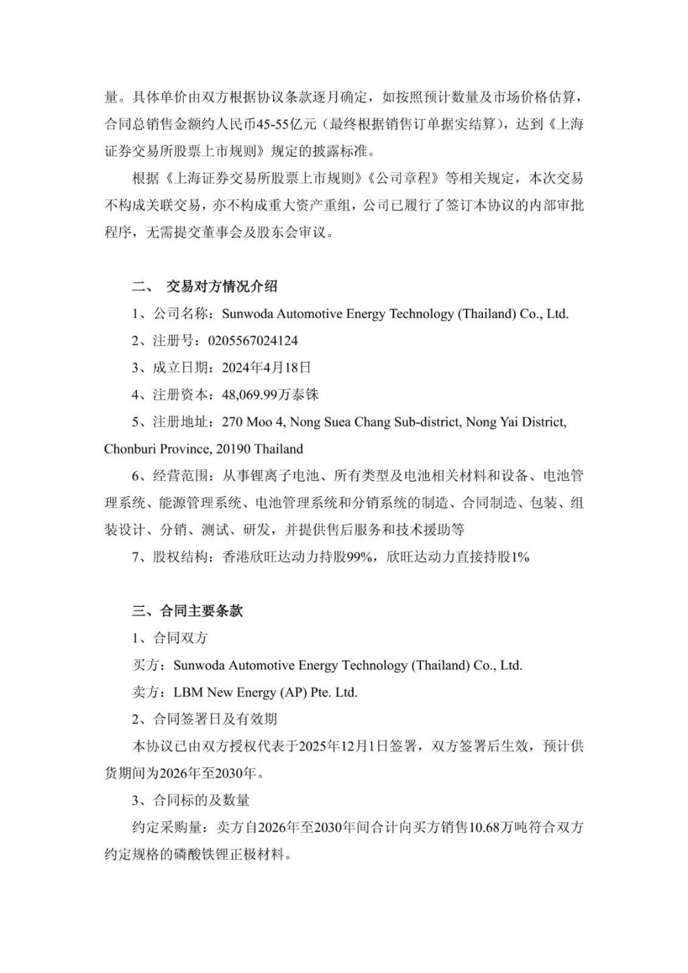 12月2日,龙蟠科技发布公告称,公司控股孙公司LBM New Energy (AP) Pte. Ltd.与Sunwoda Automotive Energy Technology (Thailand) Co., Ltd签署了《长期采购协议》。协议约定,预计将由锂源(亚太)自2026年至2030年间合计向Sunwoda销售10.68万吨符合双方约定规格的磷酸铁锂正极材料,并约定最低采购量与最大供应量,双方约定每两年校准一次需求量纲,校准后的需求量不低于协议已约定的年度最低采购量。具体单价由双方根据协议条款逐月确定,如按照预计数量及市场价格估算,合同总销售金额约人民币45-55亿元(最终根据销售订单据实结算)。