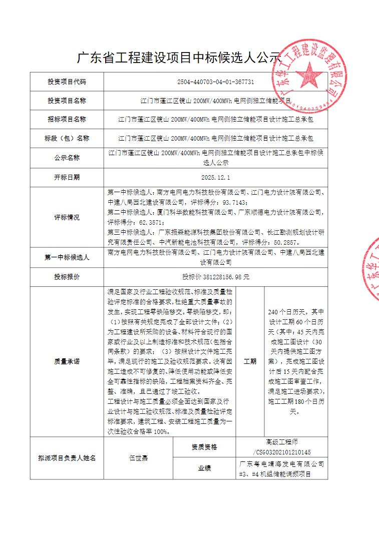 12月3日,江门市蓬江区镜山200MW/400MWh电网侧独立储能项目设计施工总承包中标候选人公示。