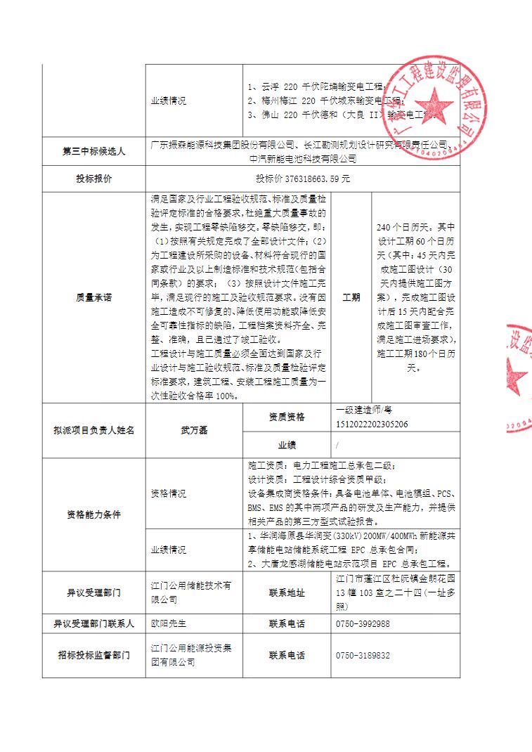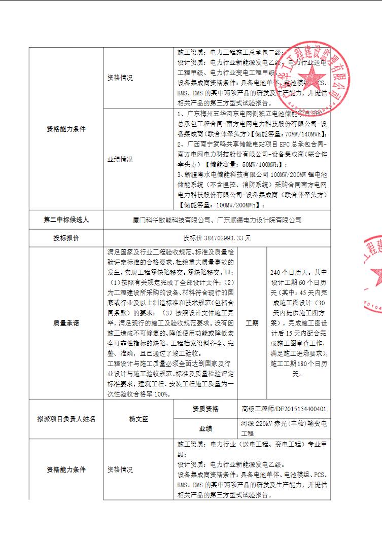 中标候选人第1名为南方电网电力科技股份有限公司、江门电力设计院有限公司、中建八局西北建设有限公司,投标报价为38122.815698万元,折合单价0.9531元/Wh;中标候选人第2名为厦门科华数能科技有限公司、广东顺德电力设计院有限公司,投标报价为38470.299333万元,折合单价0.9618元/Wh;中标候选人第3名为广东振森能源科技集团股份有限公司、长江勘测规划设计研究有限责任公司、中汽新能电池科技有限公司,投标报价为37631.866359万元,折合单价0.9408元/Wh。
