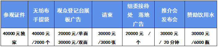 ●标准展位:国内企业:(长宽高:3m3m2.5m)¥12,800 / 个;国际企业:¥20,000/个(含搭建楣板、洽谈桌椅及照明等)