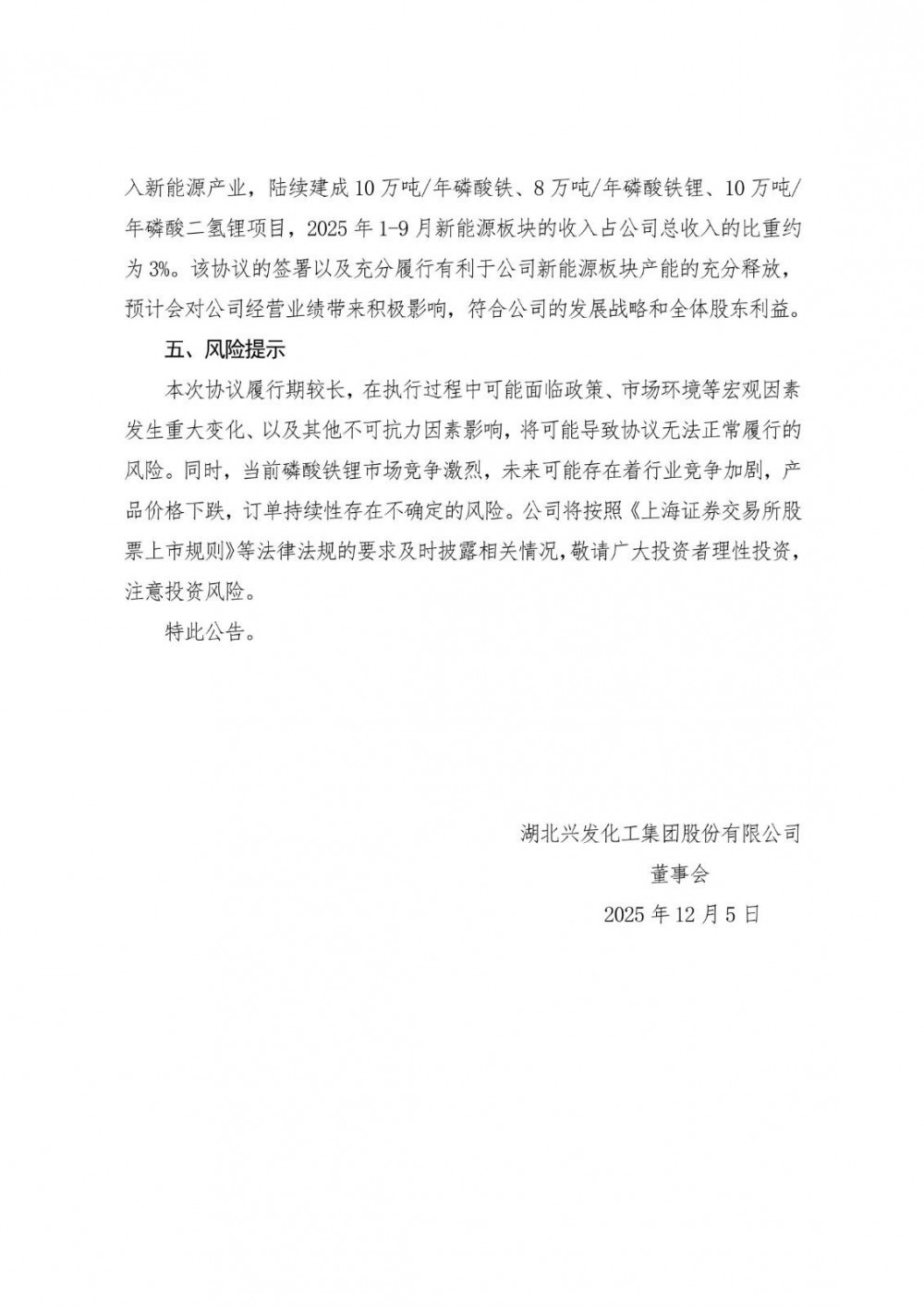 兴发集团表示,公司主营业务为精细磷化工系列产品的生产与销售,近年来,公司顺势切入新能源产业,陆续建成10万吨/年磷酸铁、8万吨/年磷酸铁锂、10万吨/年磷酸二氢锂项目,2025年1-9月新能源板块的收入占公司总收入的比重约为3%。该协议的签署以及充分履行有利于公司新能源板块产能的充分释放,预计会对公司经营业绩带来积极影响,符合公司的发展战略和全体股东利益。