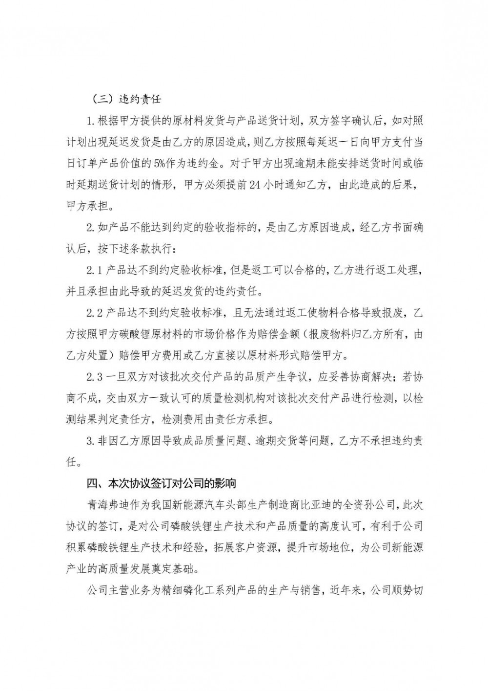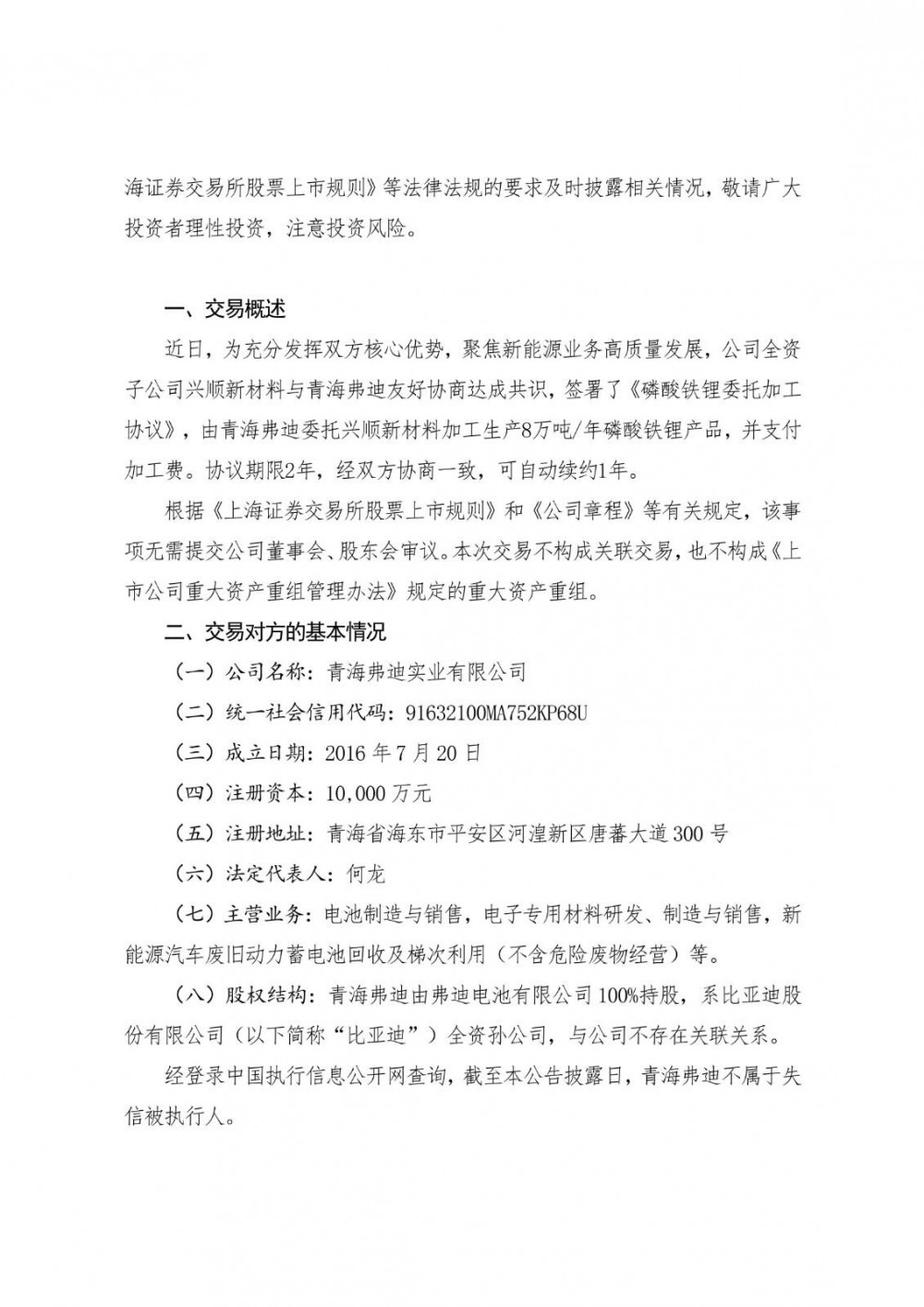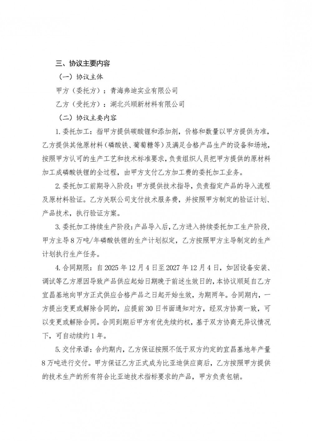 12月4日,兴发集团发布公告称,公司全资子公司湖北兴顺新材料有限公司与青海弗迪实业有限公司签署《磷酸铁锂委托加工协议》,由青海弗迪委托兴顺新材料加工生产8万吨/年磷酸铁锂产品,并支付加工费。协议期限2年,经双方协商一致,可自动续约1年。