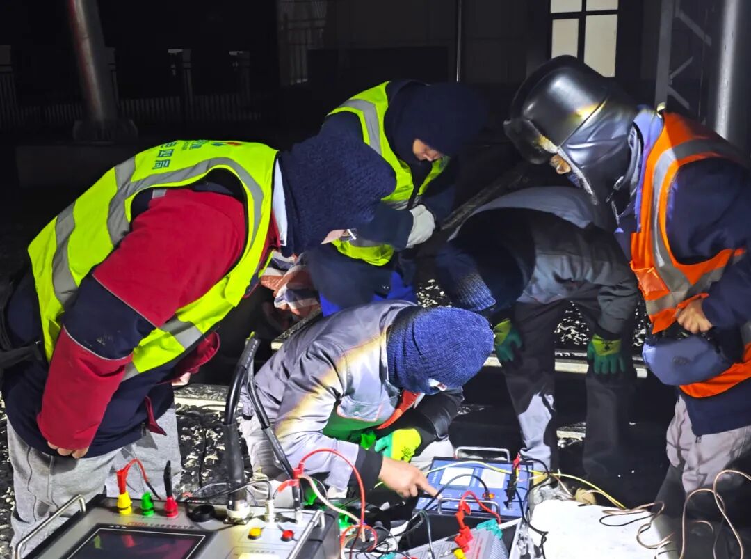 面对严寒与夜间作业的双重挑战,项目部科学统筹、高效协同,细化风险预案,紧盯安关键环节,全面筑牢安全防线。试验团队顶风冒雪,在零下30℃的极寒环境中连续奋战8小时,徒步铺设电缆24公里,确保试验顺利推进。项目全体人员团结拼搏,最终实现试验“零差错、高标准”收官,为倒送电节点达成创造了有利条件。