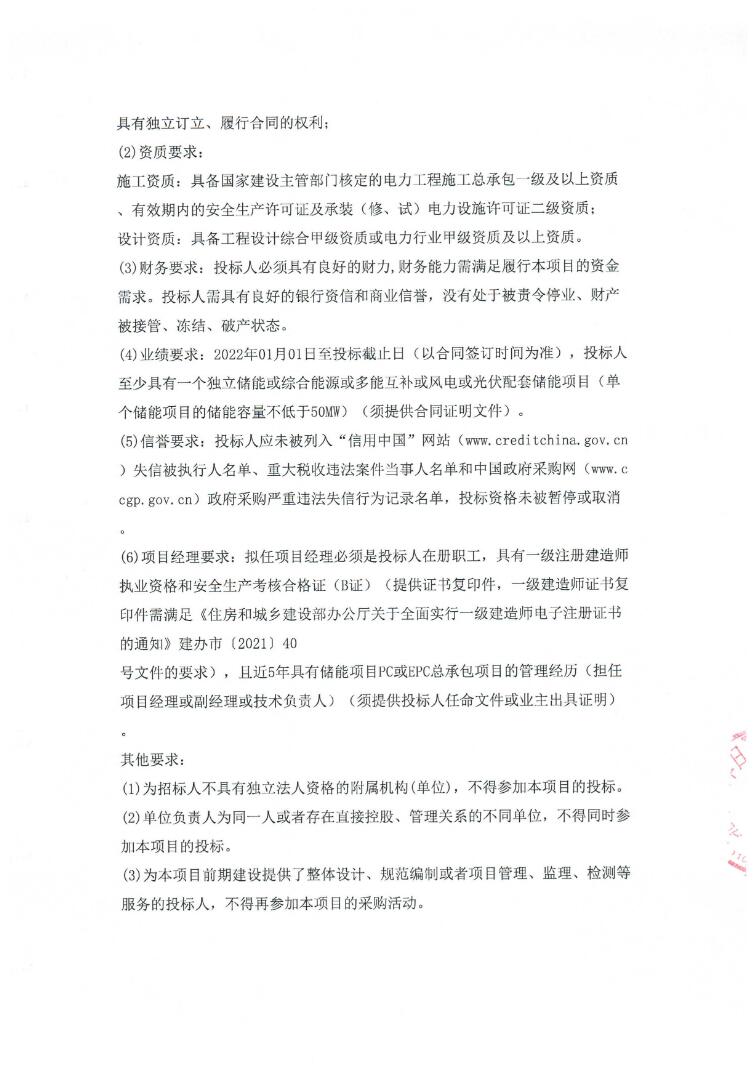 投标人需在2022年1月1日至投标截止日期间,具备至少一个容量不低于50MW的独立储能类项目经验,本次招标不接受联合体投标。