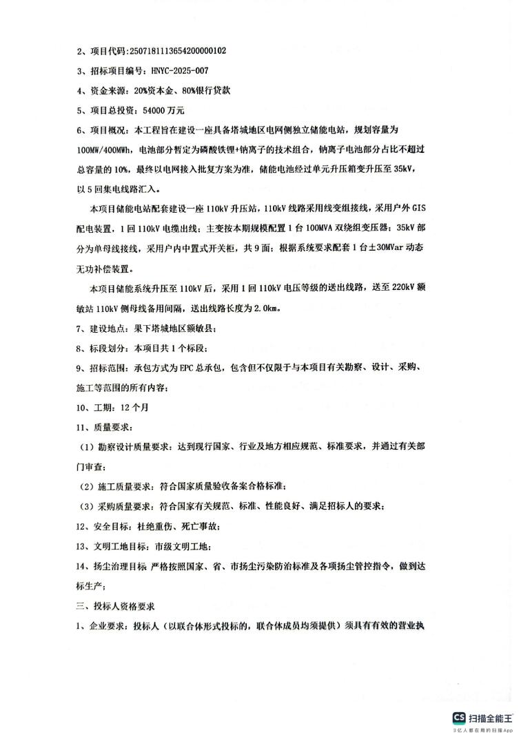 项目招标人为果下科技旗下的果下慧储(额敏)智慧能源科技有限公司,本工程新疆塔城地区建设一座电网侧独立储能电站,规划容量为100MW/400MWh,电池部分暂定为磷酸铁锂+钠离子的技术组合,钠离子电池部分占比不超过总容量的10%,最终以电网接入批复方案为准,储能电池经过单元升压箱变升压至35kV,以5回集电线路汇入。本次招标需求为EPC总承包。