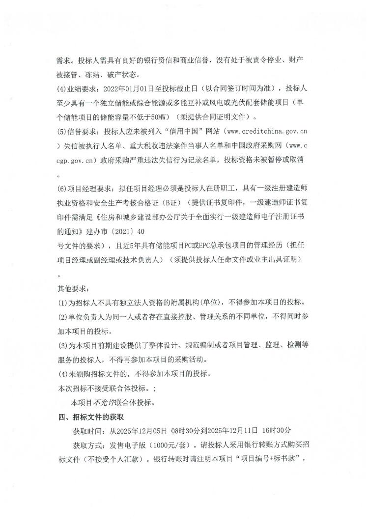 2022年01月01日至投标截止日(以合同签订时间为准),投标人至少具有一个独立储能或综合能源或多能互补或风电或光伏配套储能项目(单个储能项目的储能容量不低于50MW)(须提供合同证明文件)。