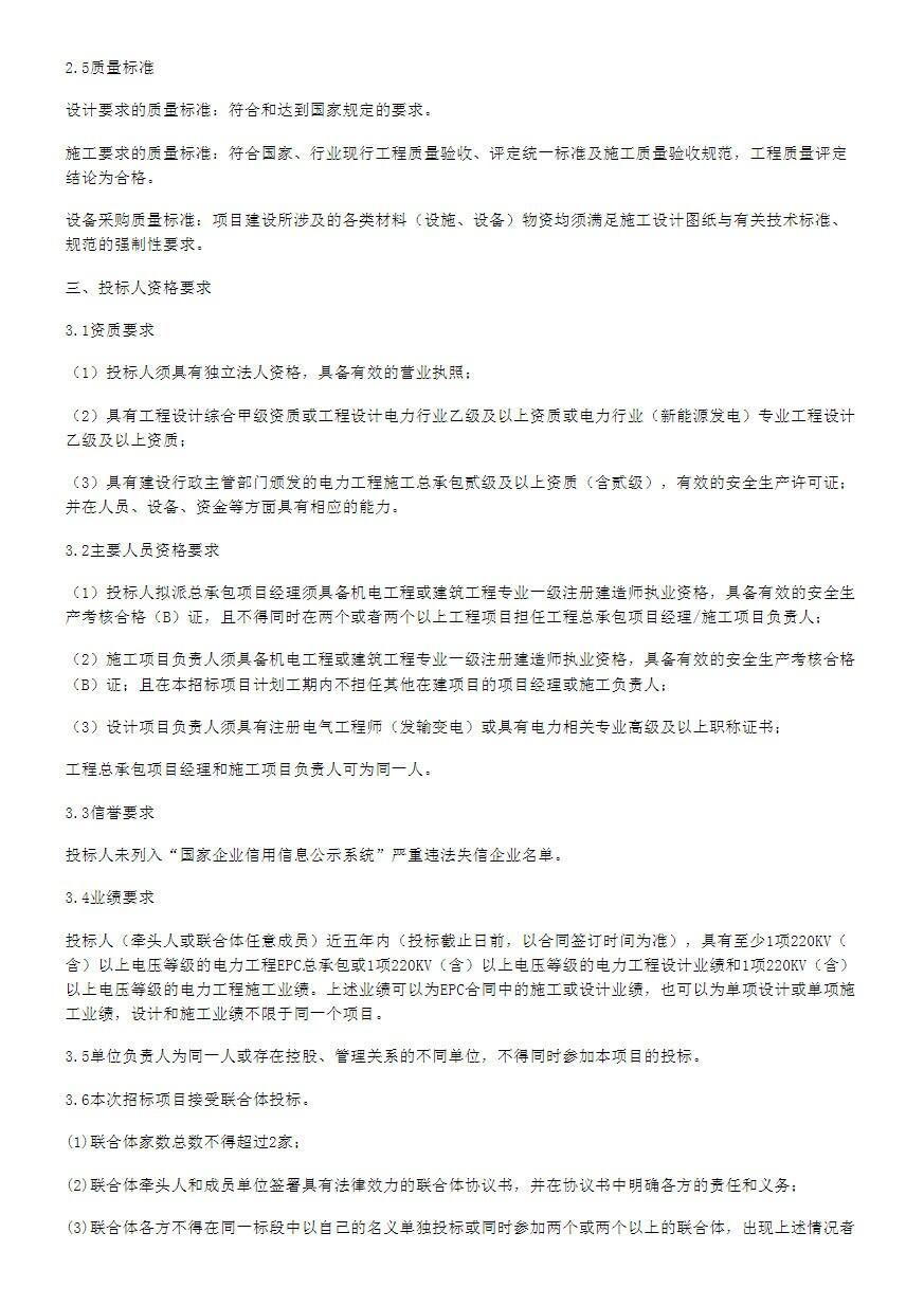 投标人(牵头人或联合体任意成员)近五年内(投标截止日前,以合同签订时间为准),具有至少1项220KV(含)以上电压等级的电力工程EPC总承包或1项220KV(含)以上电压等级的电力工程设计业绩和1项220KV(含)以上电压等级的电力工程施工业绩。上述业绩可以为EPC合同中的施工或设计业绩,也可以为单项设计或单项施工业绩,设计和施工业绩不限于同一个项目。