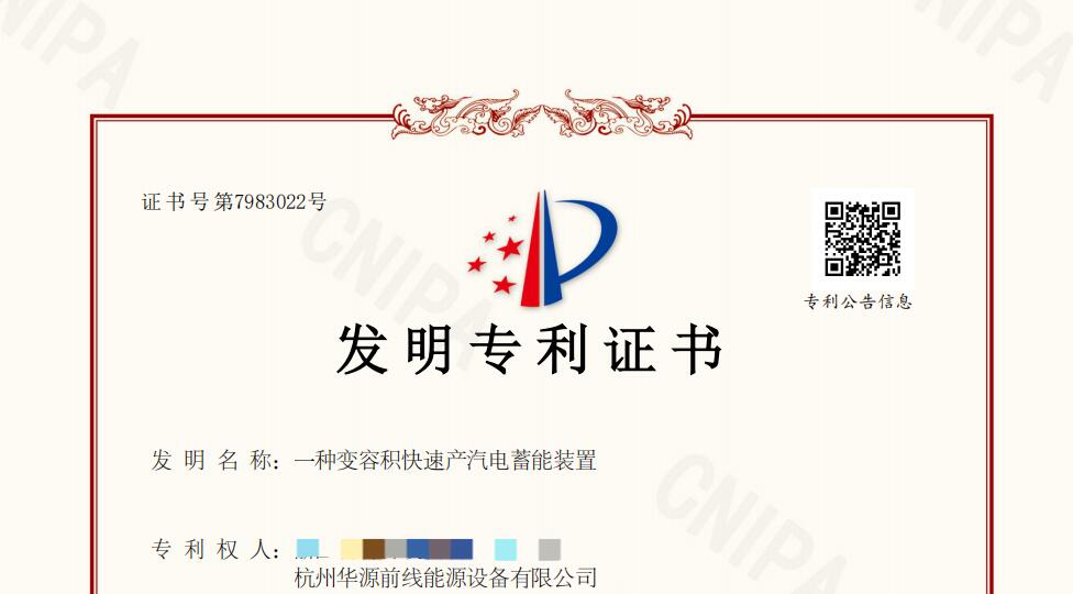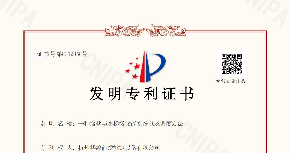 近日,中国能建-杭州华源前线能源设备有限公司(以下简称“华源前线”)凭借在零碳能源、清洁储能领域的技术深耕,连续获得五项国家知识产权局授权的发明专利证书,专利技术覆盖清洁储能多个核心方向,再次彰显企业在清洁能源领域的创新实力与技术领先地位。