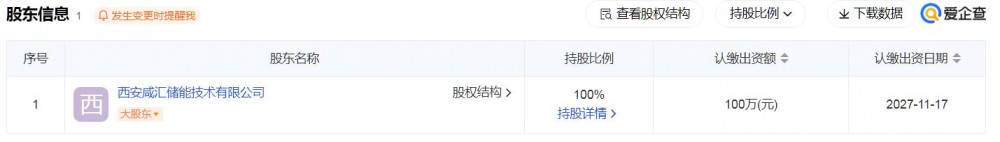 股东信息显示,西安咸汇储能技术有限公司由深圳市汇川技术股份有限公司的全资子公司北京汇川在线技术有限责任公司100%持股。
