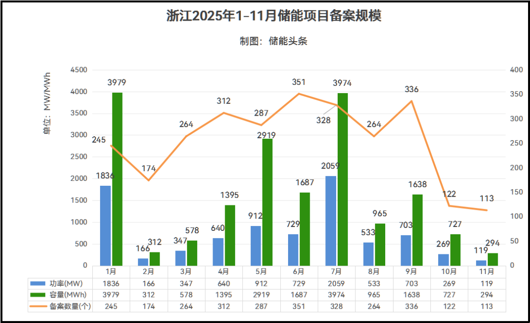 1-11月份浙江储能备案规模和数量如下: